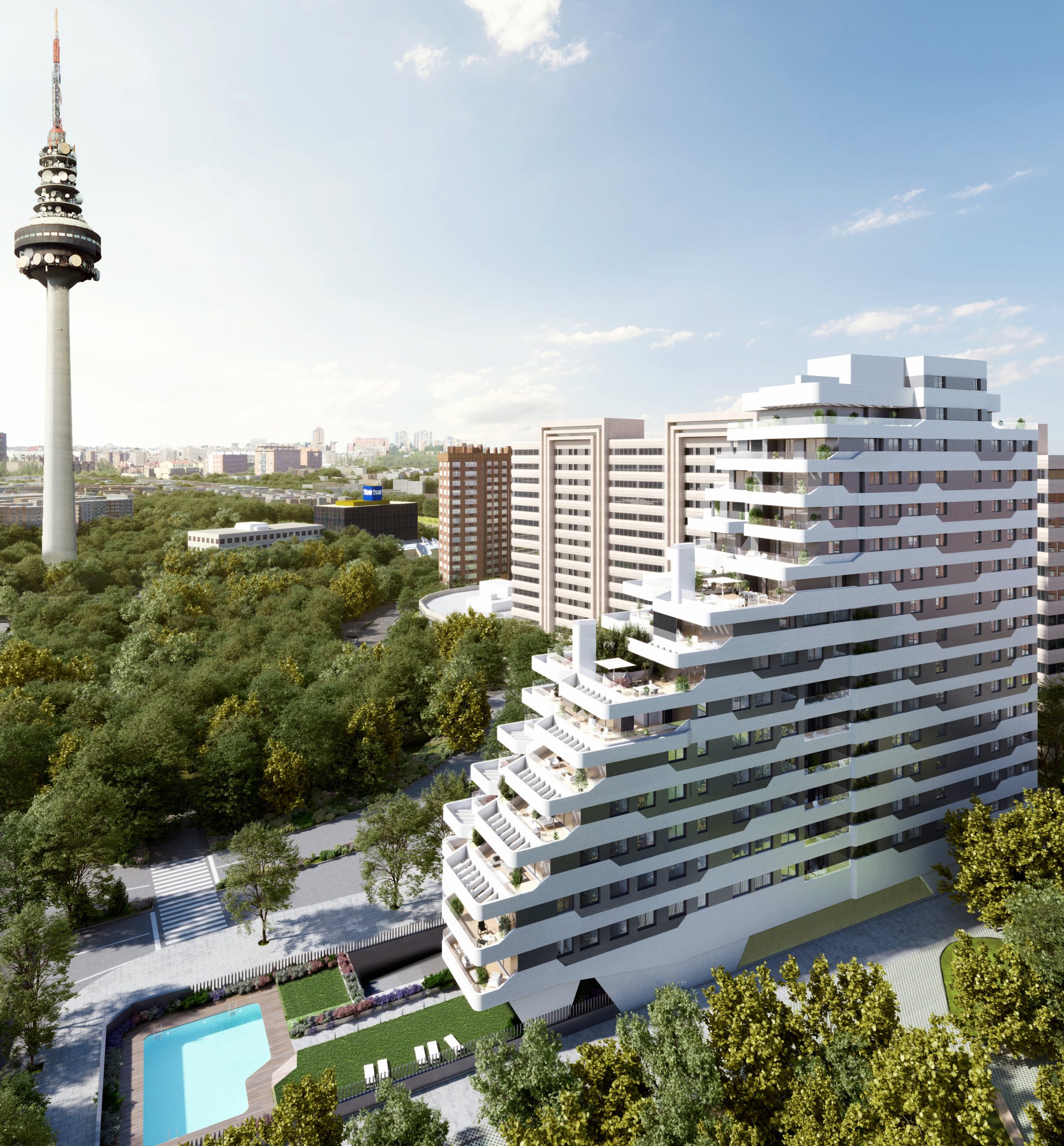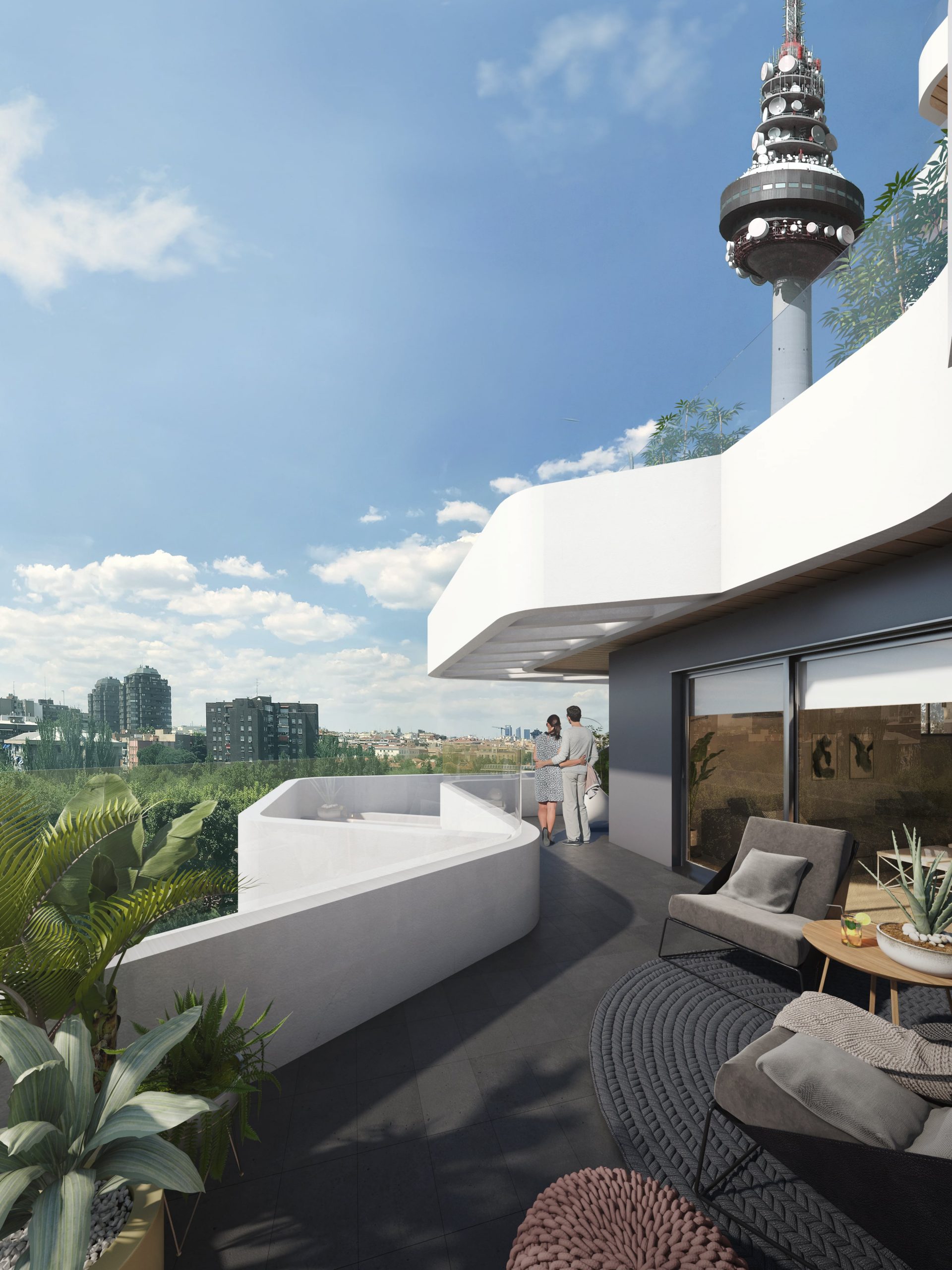 El edificio ha sido concebido con un diseño aterrazado que dota a las viviendas de amplias terrazas privadas y permite disfrutar de vistas privilegiadas al skyline de Madrid, integrando el confort con el entorno urbano de forma elegante y funcional.