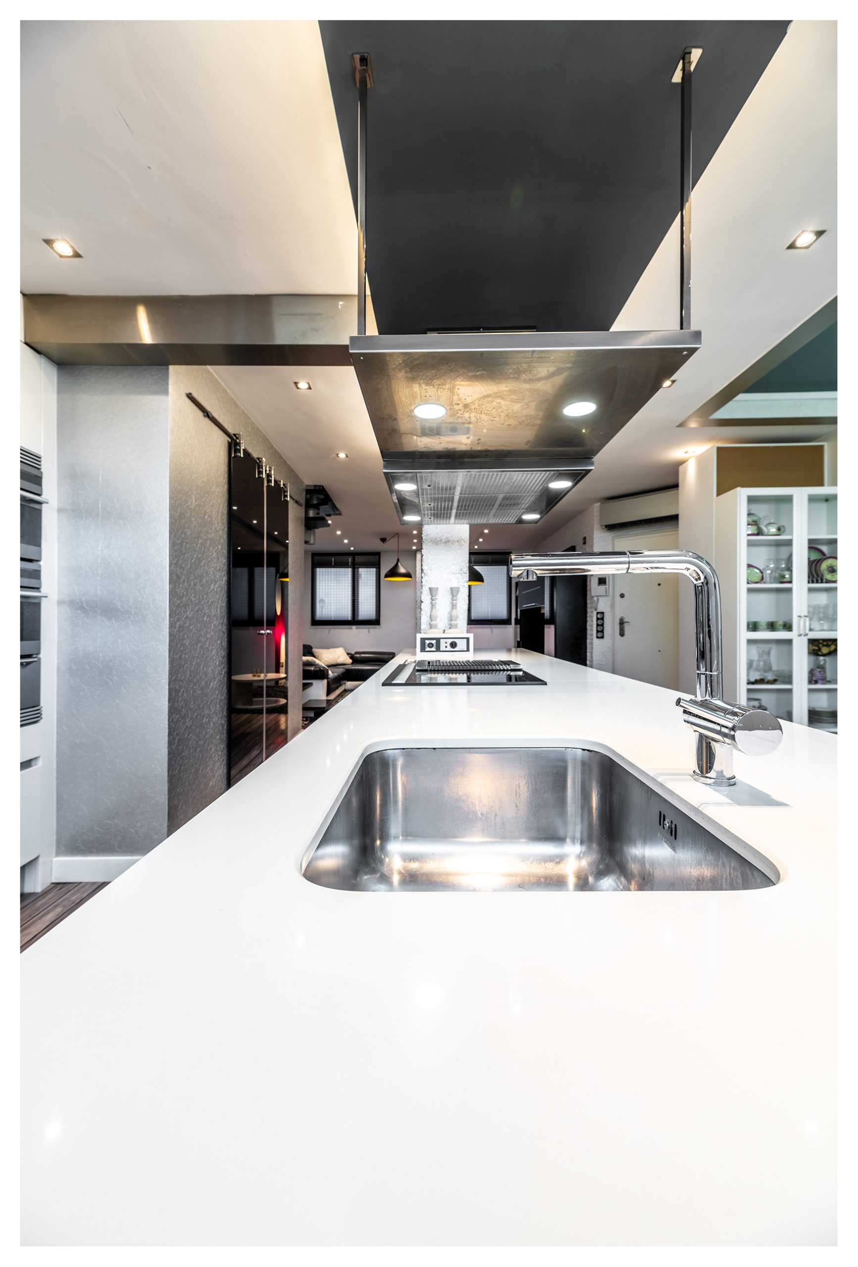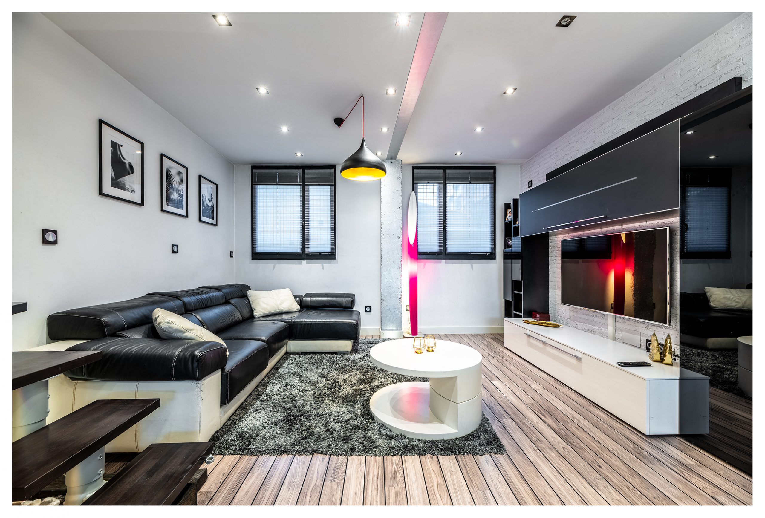 Cuando entramos en la vivienda, nos encontramos un espacio de unos 50 m2 donde se fusiona un acogedor salón y una cocina espectacular valorada en más de 30.000€. Un diseño basado en los colores neutros con pequeñas pinceladas puntuales de color. En el salón, se podrá disfrutar de una sesión de cine en el increíble sofá con chaiselonge de piel italiana de más de 3 metros. Numerosos puntos de luces indirectas distribuidos por el suelo de la estancia, harán aún más acogedores, si cabe, esos momentos de relax. El salón dispone de una televisión de LED Samsung de 42” con todos los cables ocultos.