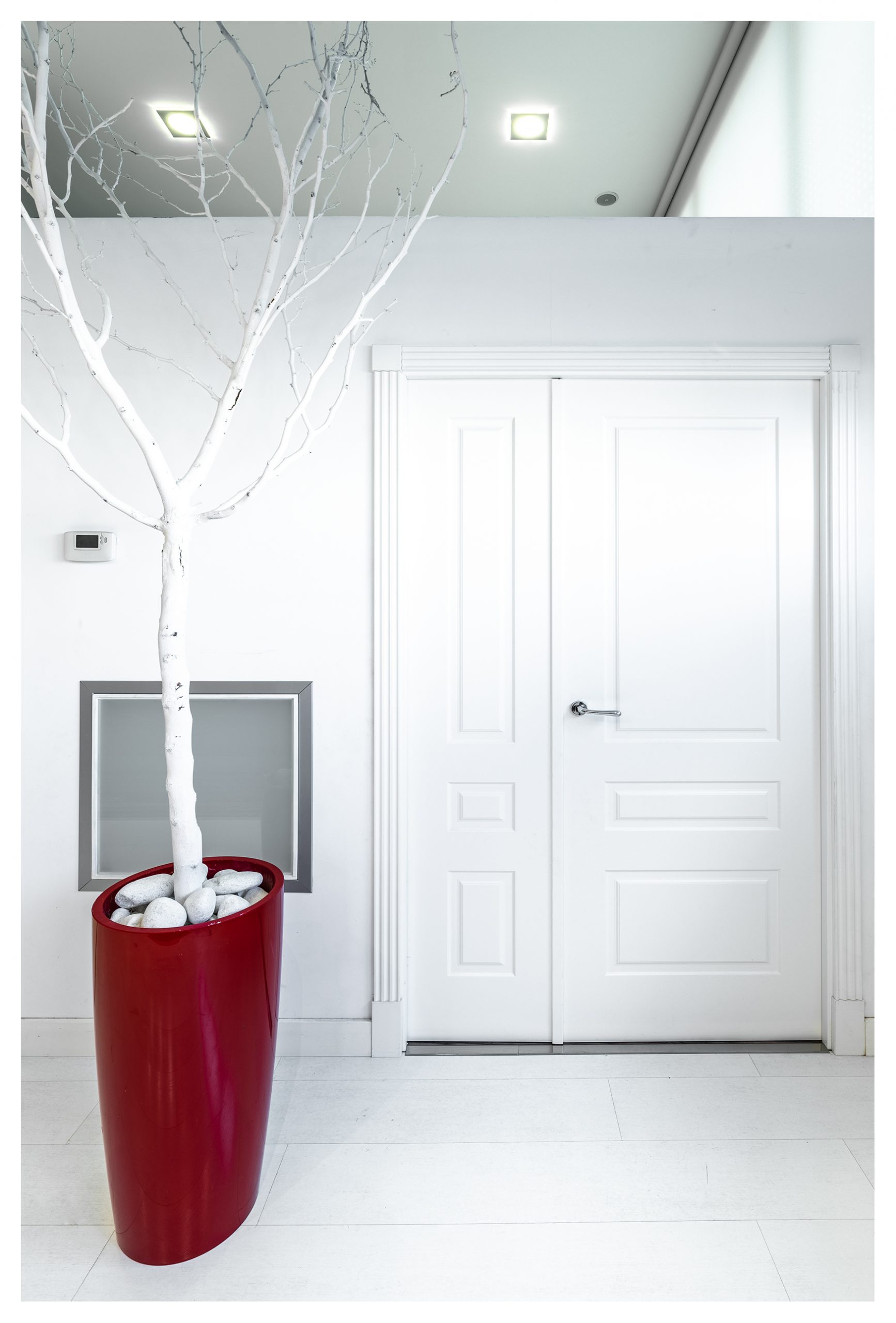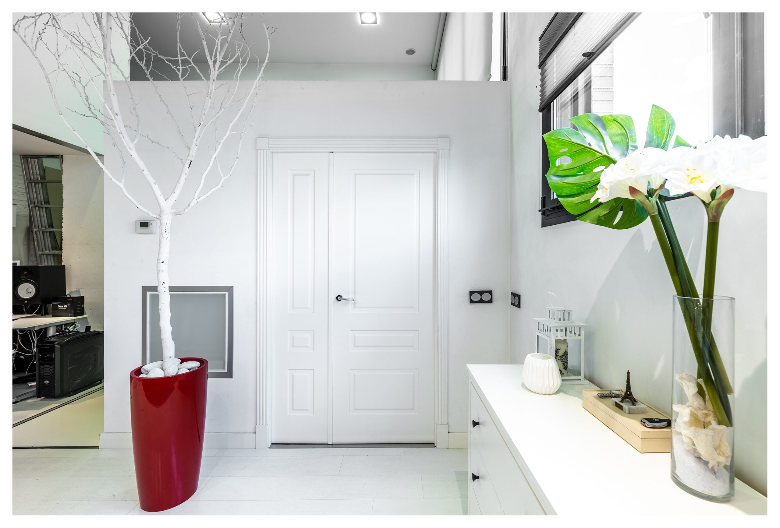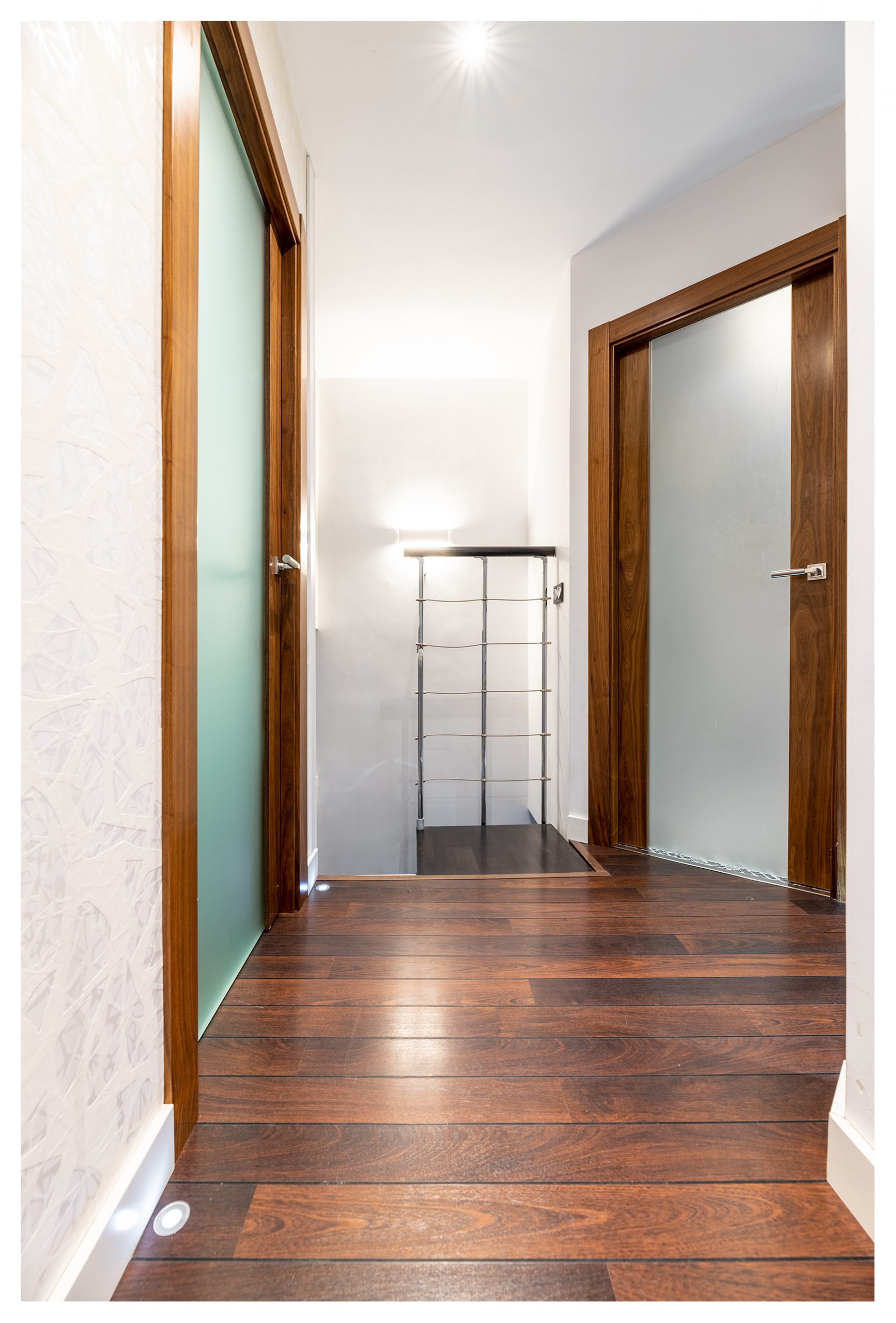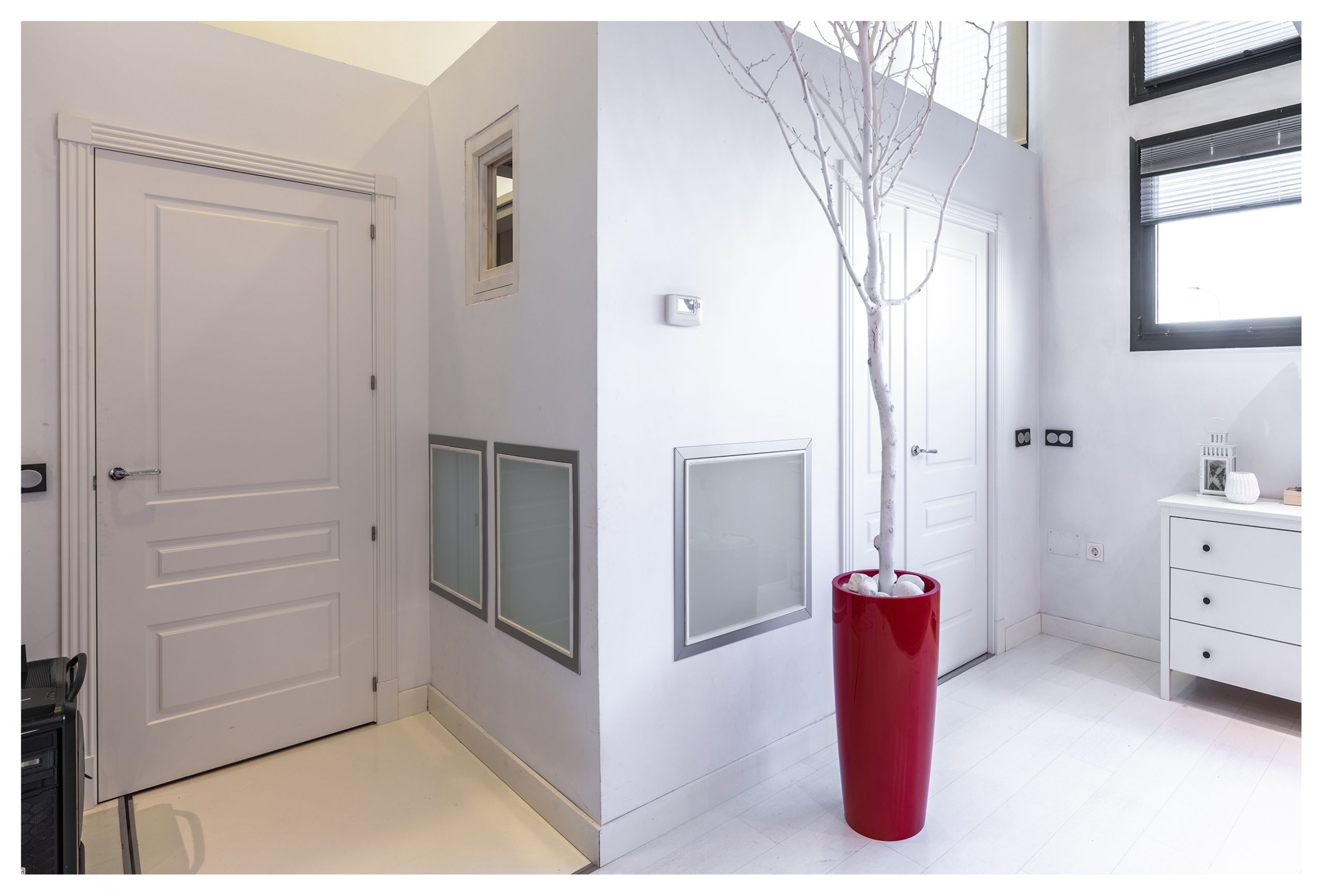 Las puertas de la planta inferior están lacadas en color blanco, con un diseño y unas jambas del tipo Boiseries. En la planta superior, las puertas tienen incrustadas una pieza de un cristal que abarca toda la superficie vertical de las mismas. Todas las estancias están dotadas de señal de TV, TLF, conexión en RED e hilo musical. Es la única vivienda del inmueble dotada de vídeo-portero, y además en color.