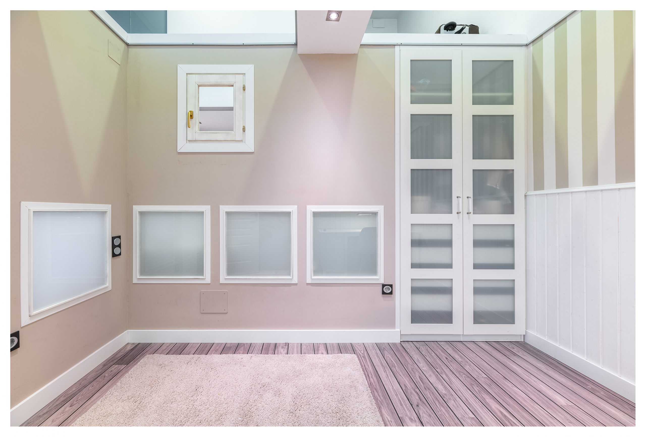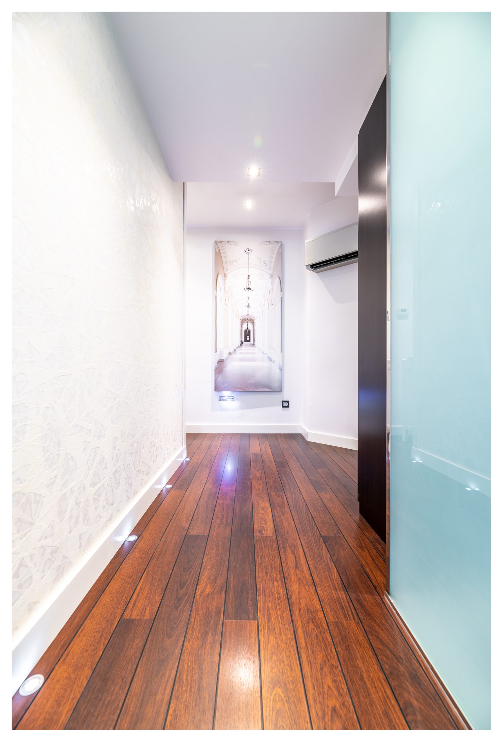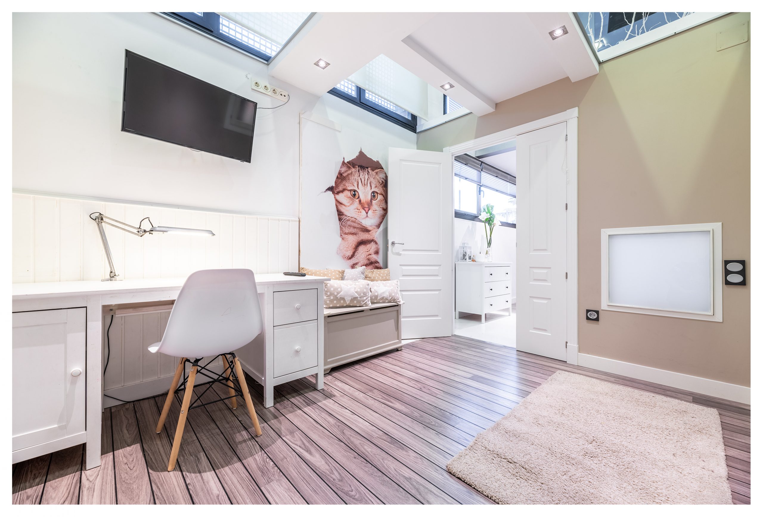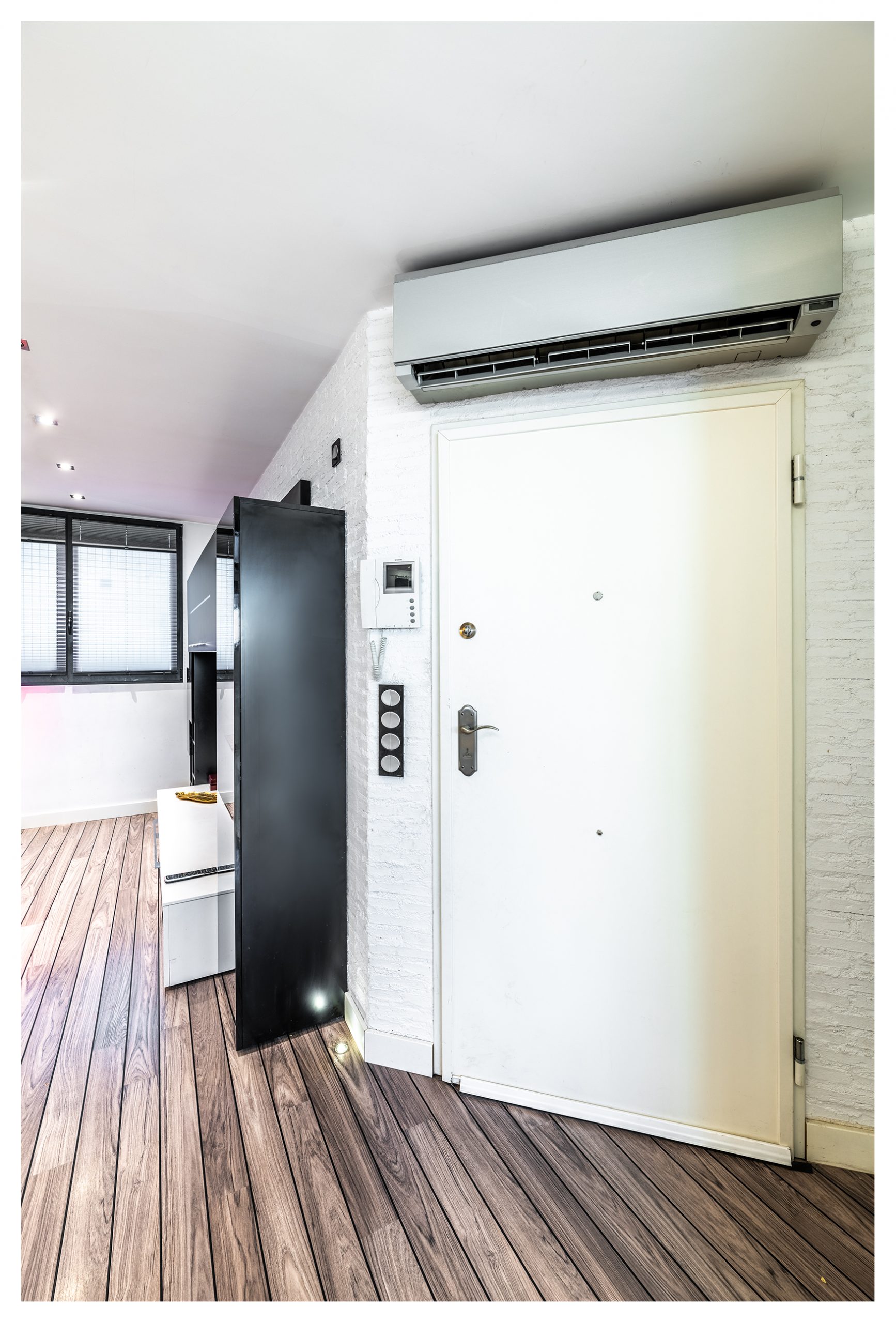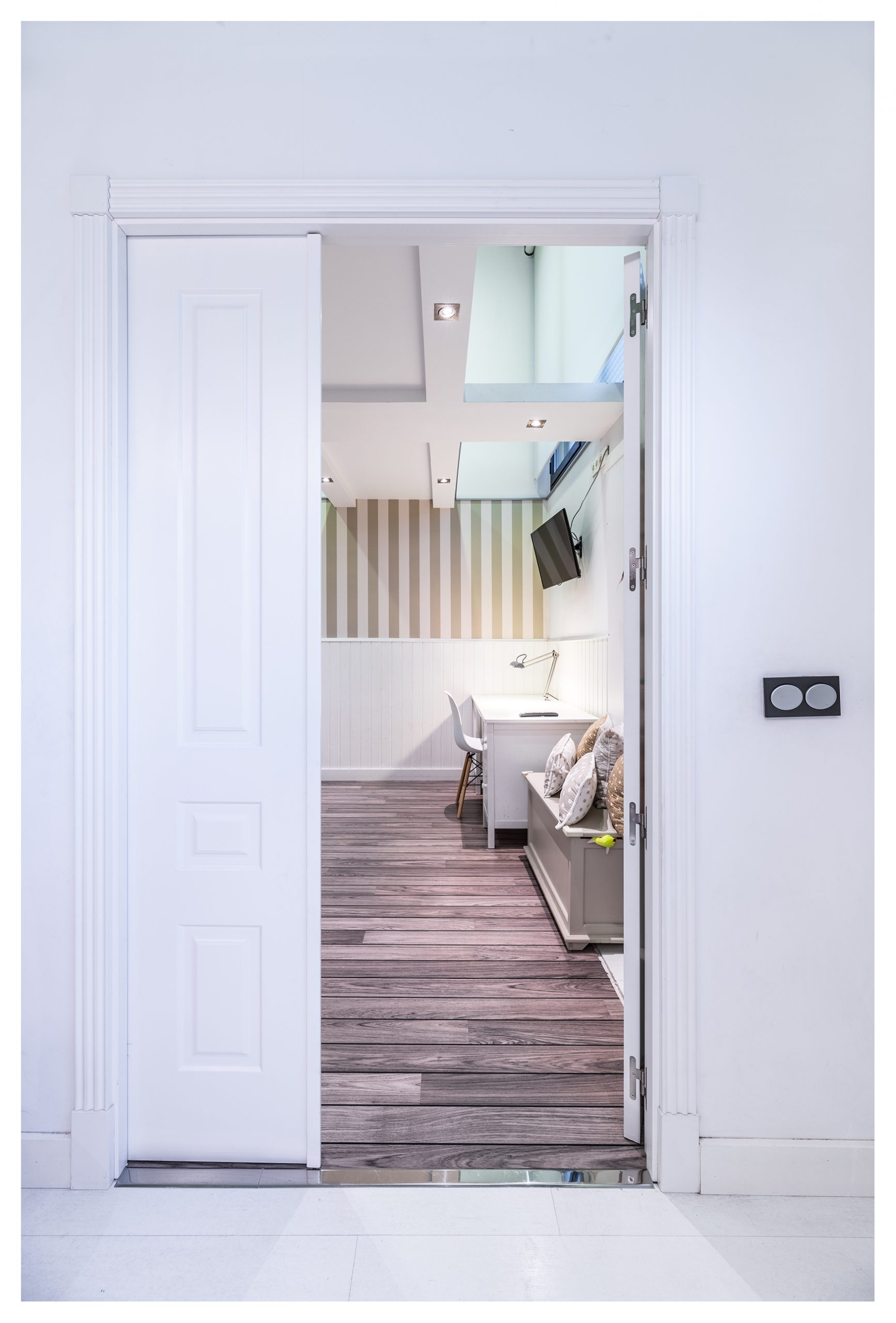 Las puertas de la planta inferior están lacadas en color blanco, con un diseño y unas jambas del tipo Boiseries. En la planta superior, las puertas tienen incrustadas una pieza de un cristal que abarca toda la superficie vertical de las mismas. Todas las estancias están dotadas de señal de TV, TLF, conexión en RED e hilo musical. Es la única vivienda del inmueble dotada de vídeo-portero, y además en color.