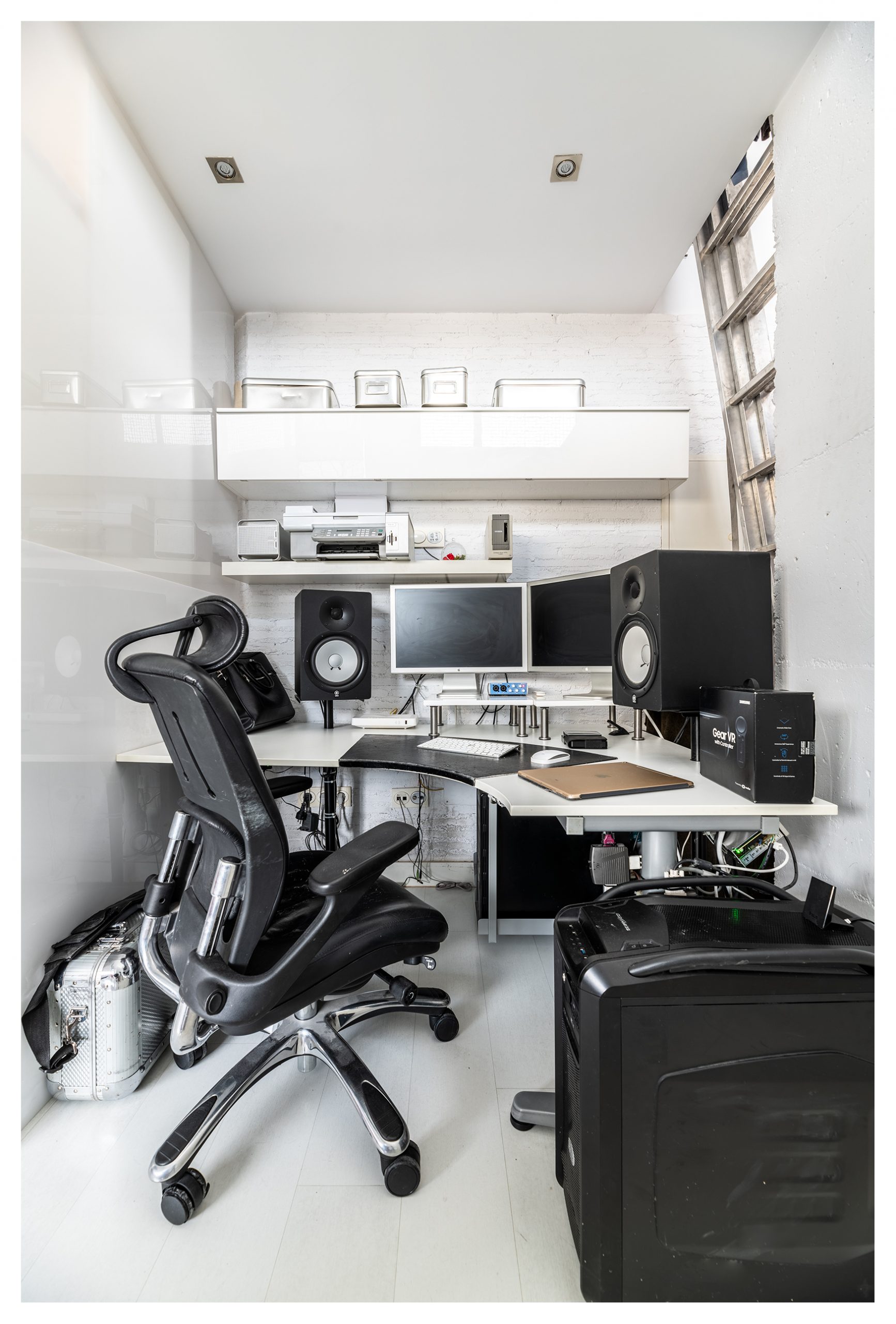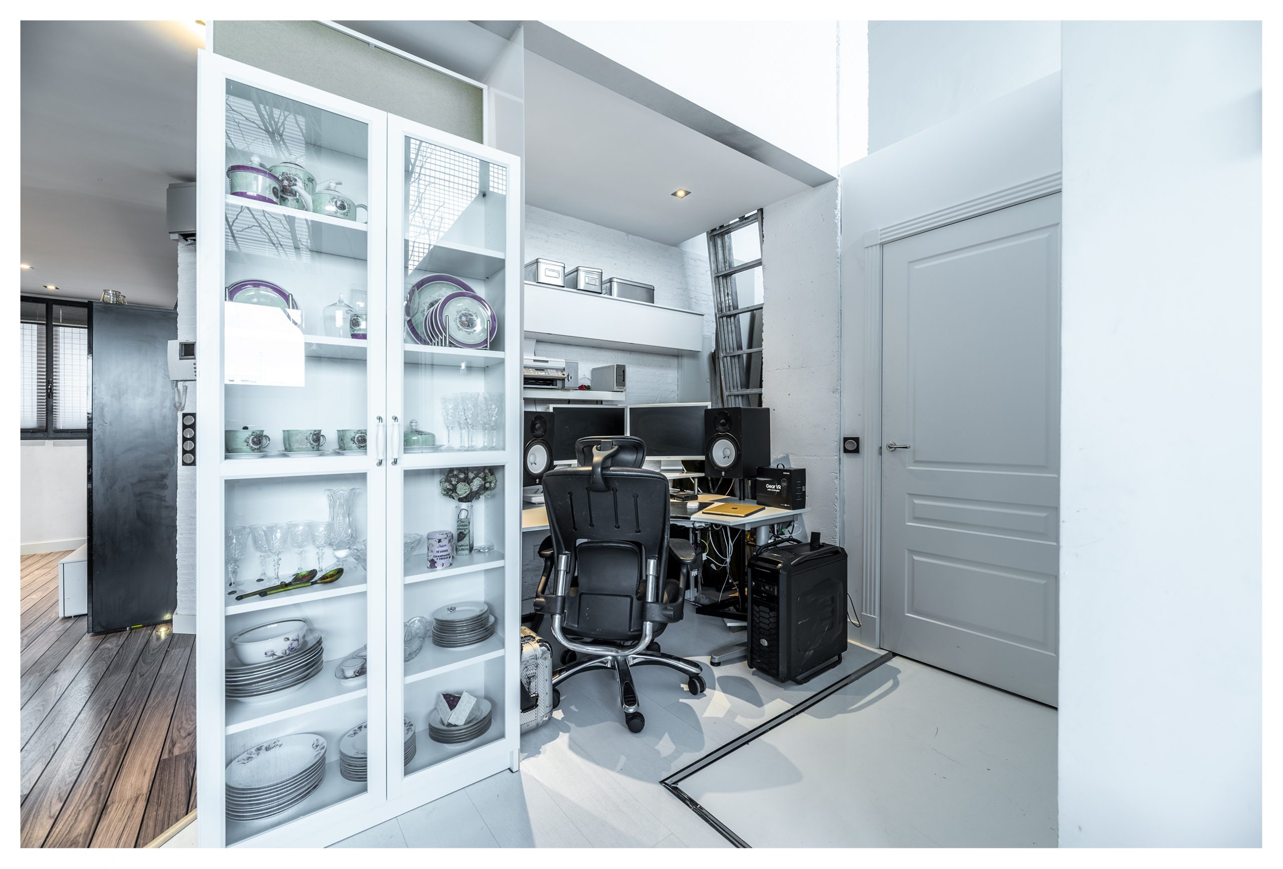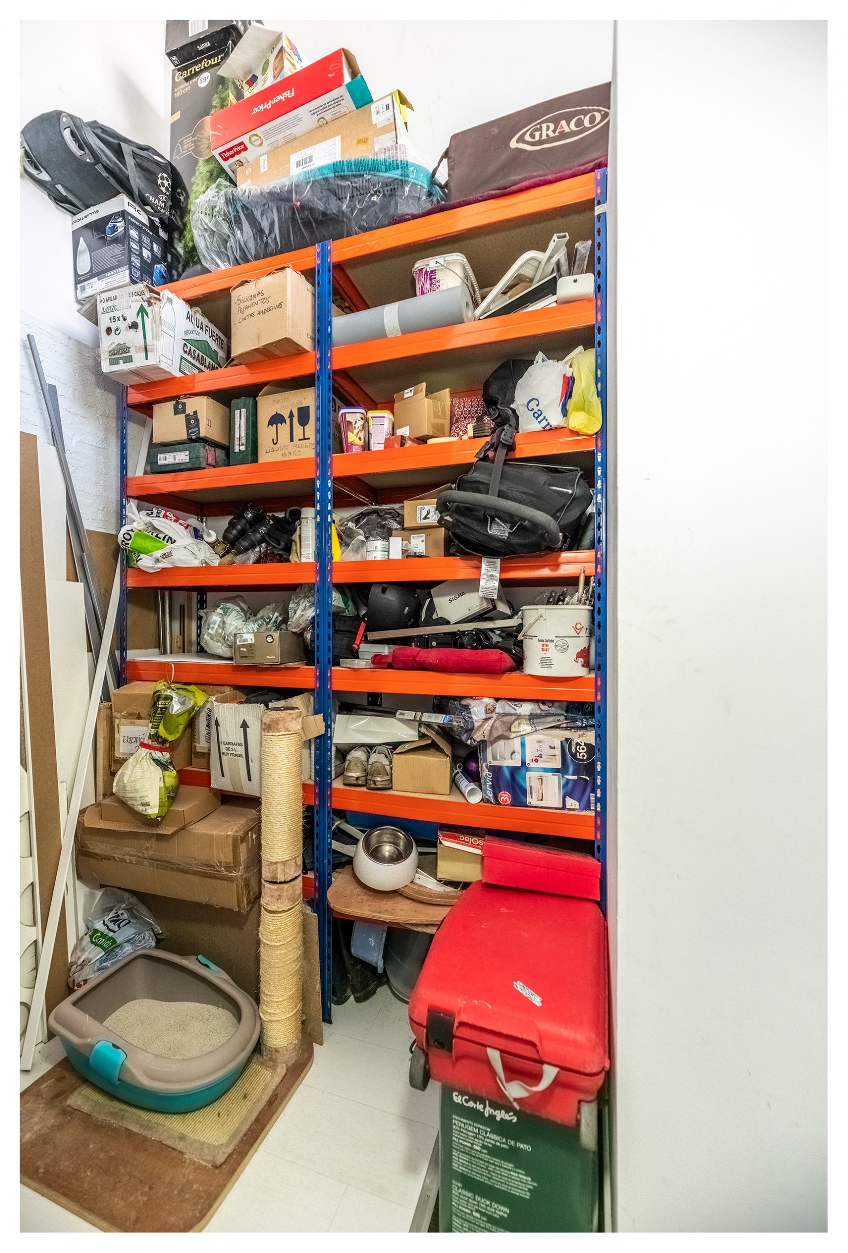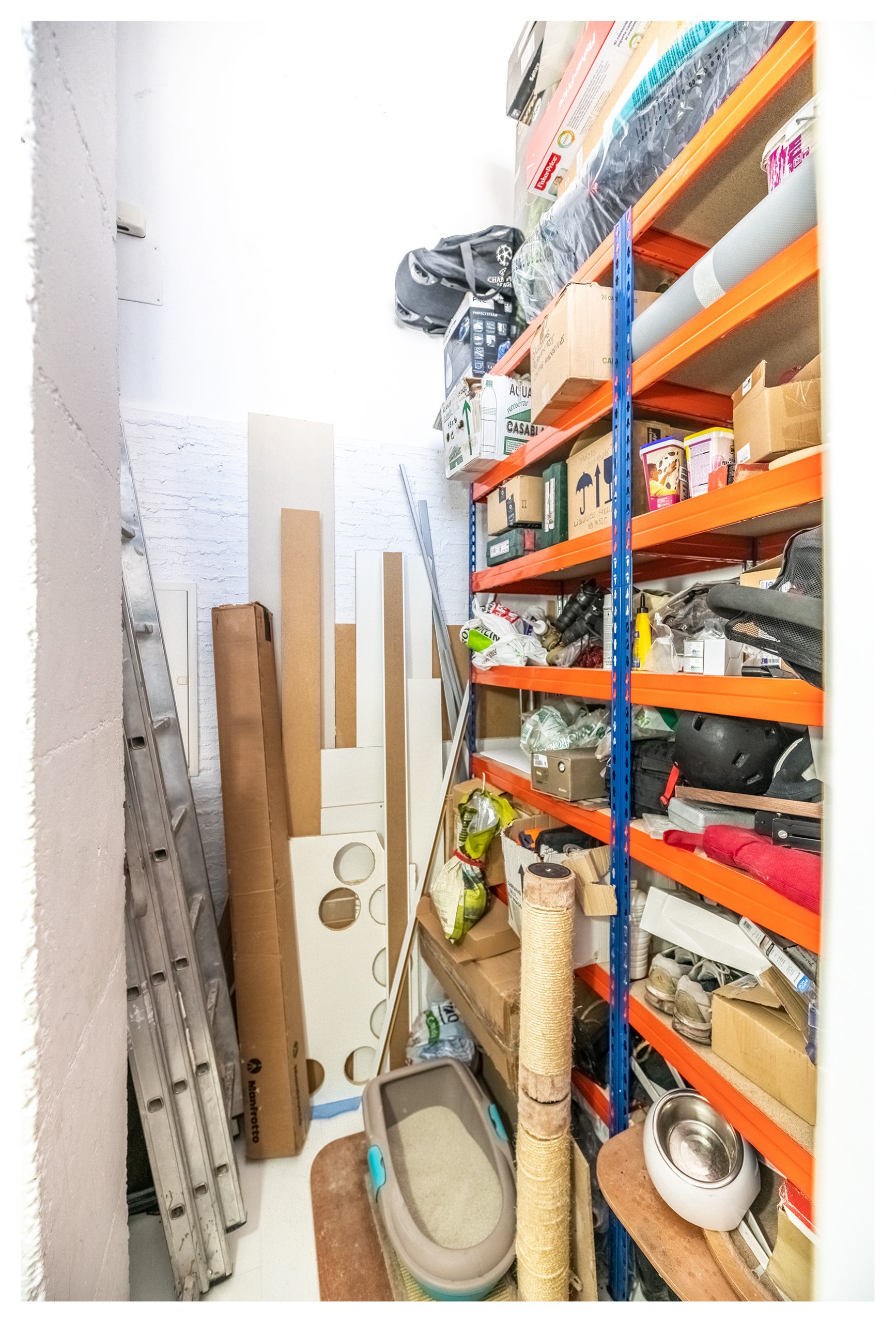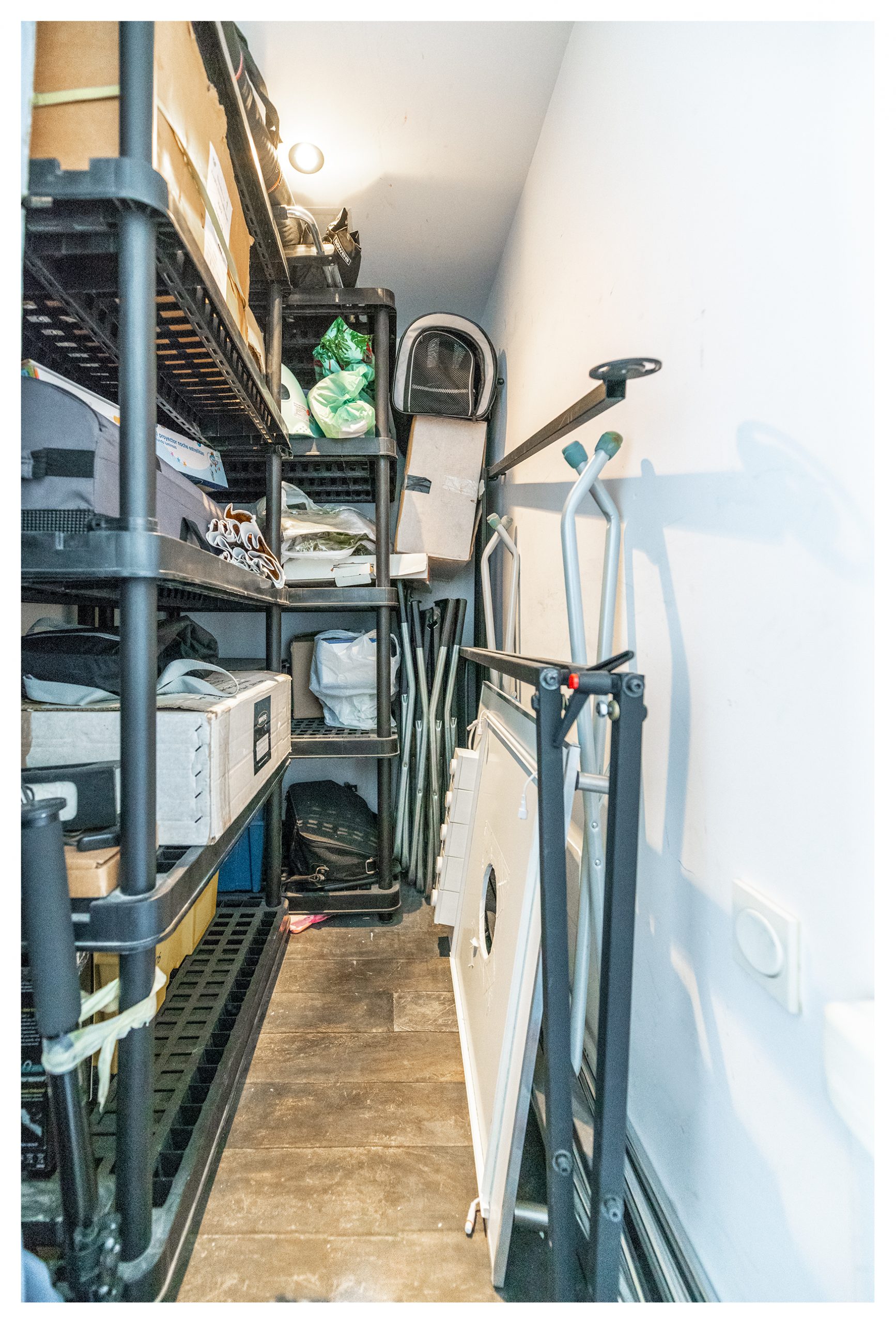 En esta planta, también nos encontramos una zona pensada para un puesto de trabajo a donde llegan todo tipo de conexiones de telecomunicaciones (red, tlf, tv, hilo musical, etc.…). Así mismo, y en este mismo nivel, tenemos una espectacular zona destinada a trastero con estanterías industriales de 3 metros de altura y 2 metros de ancho. Cada una de las baldas soporta 250kg, es decir, más de 3500 kg en total. En ese mismo espacio, nos encontramos una escalera de obra, que además de para facilitarnos el día a día en el almacenamiento y uso de la citada estantería, nos da acceso a otro trastero elevado para almacenar aquellos elementos menos recurrentes.