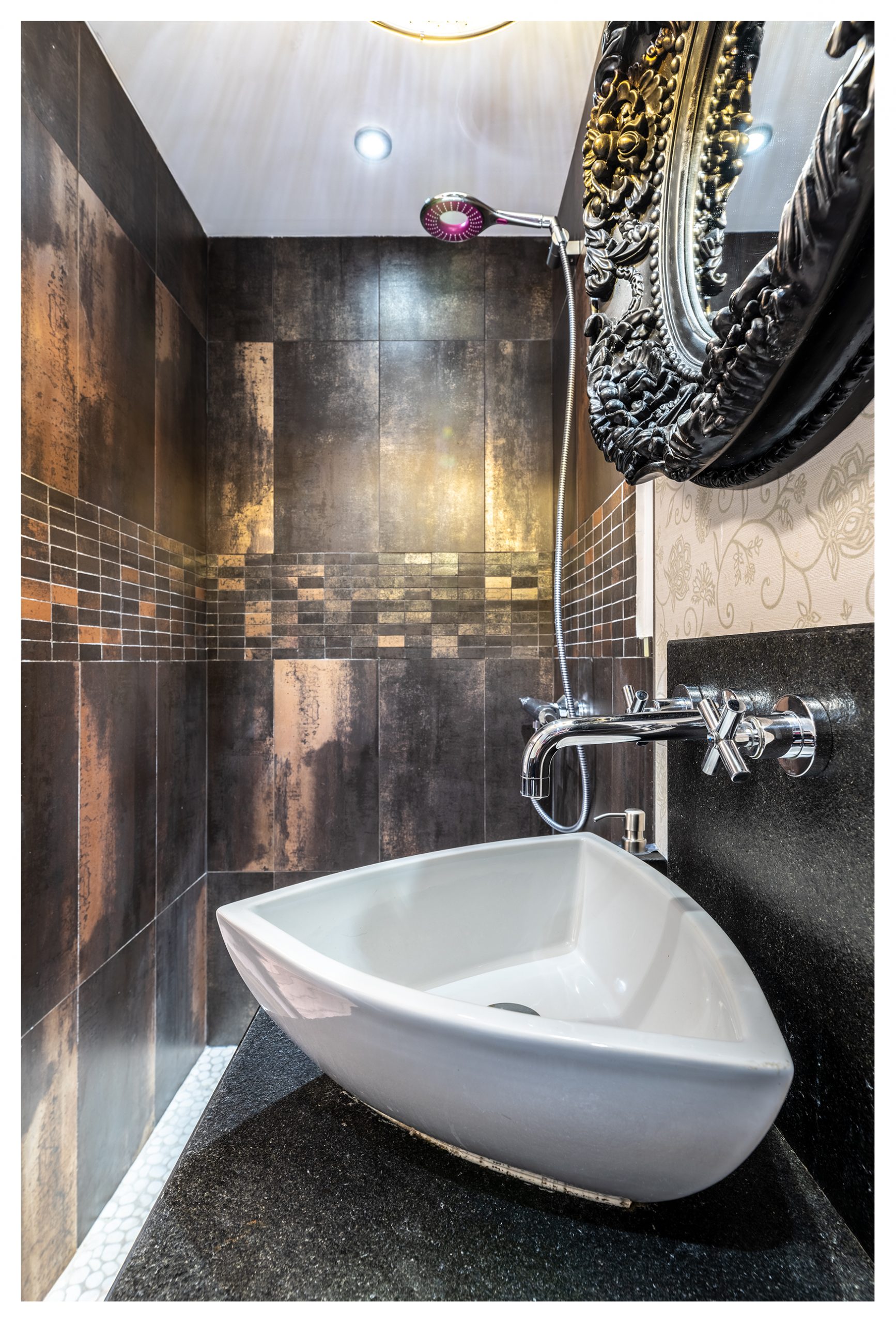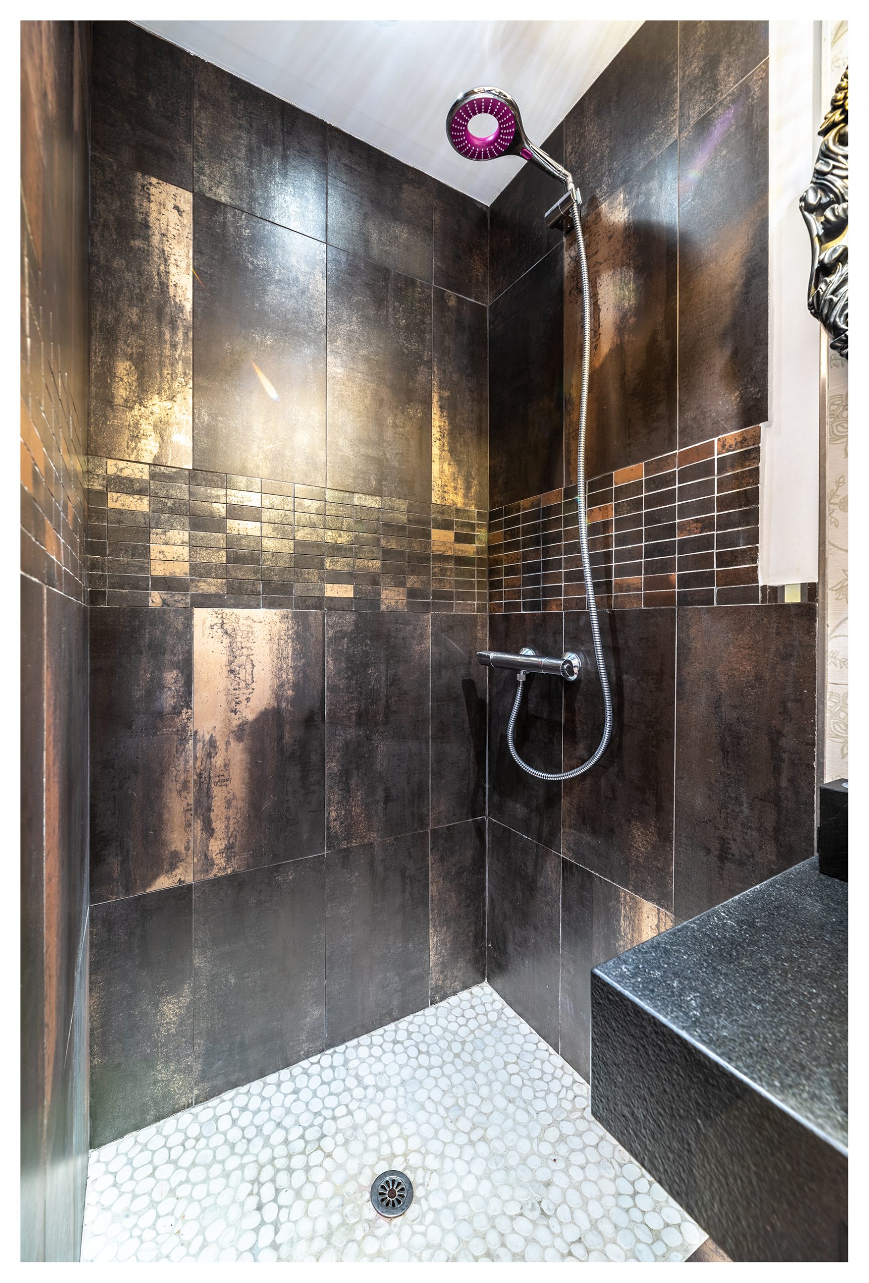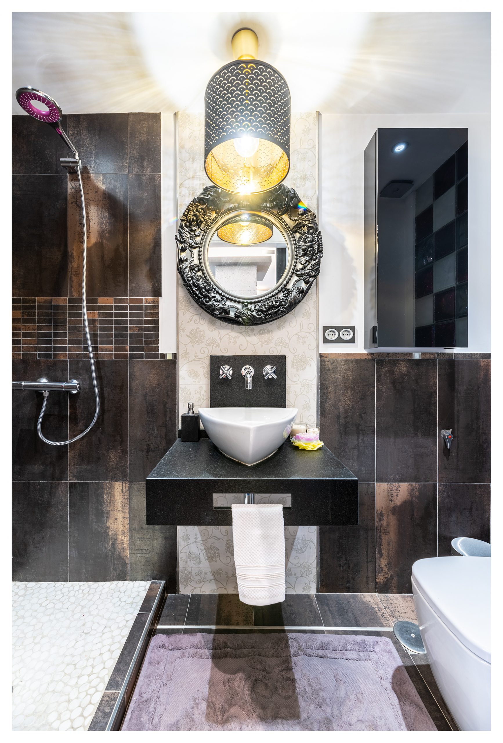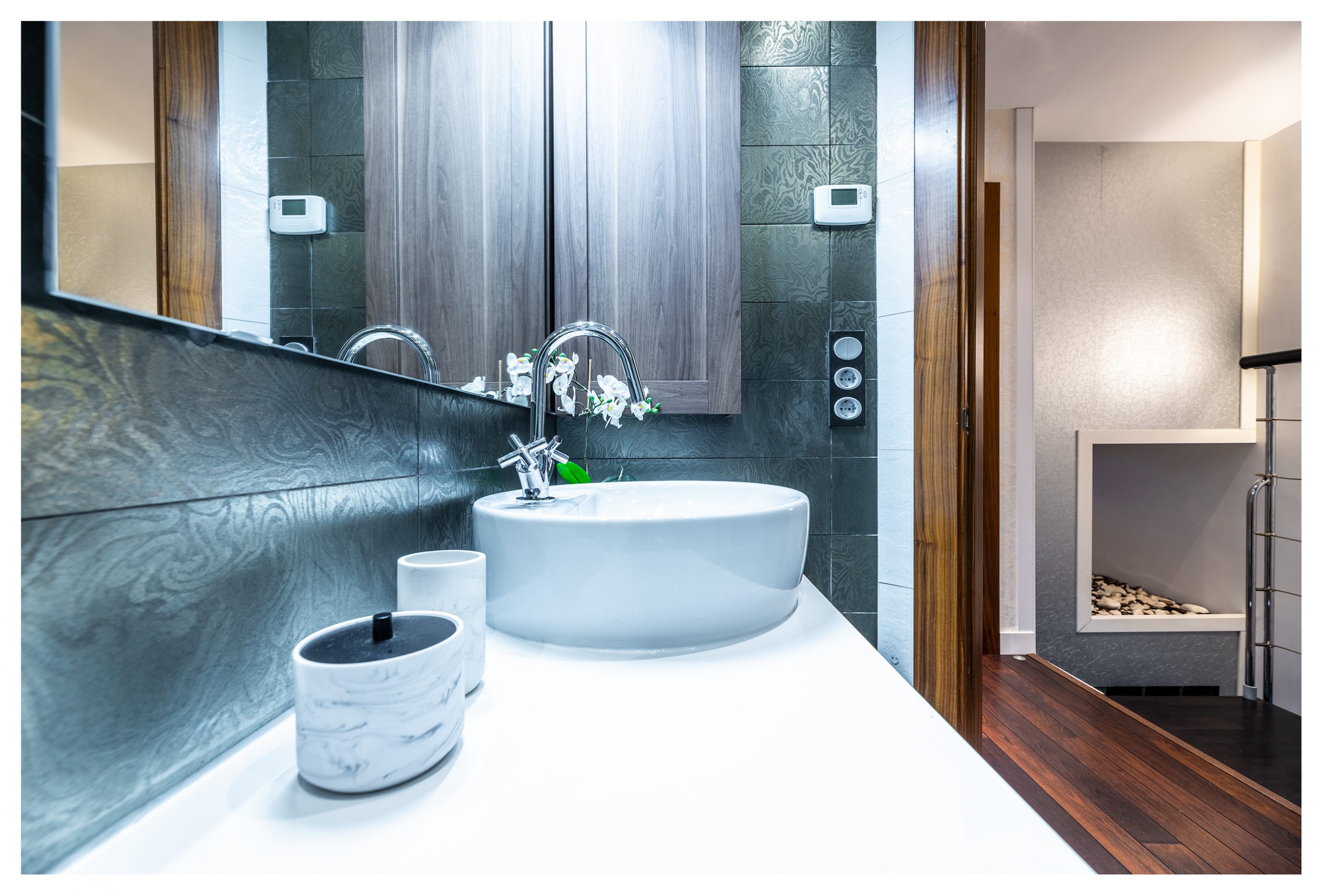 En la misma planta baja, disponemos de un baño minimalista con puertas correderas de cristal templado en negro. Un mueble de baño diseñado a medida en Mármol negro rugoso desde donde sale la espectacular grifería encastrada de la marca Roca. Sanitario y lavabo de diseño exclusivo, así como ducha de obra y superficies porcelánicas.