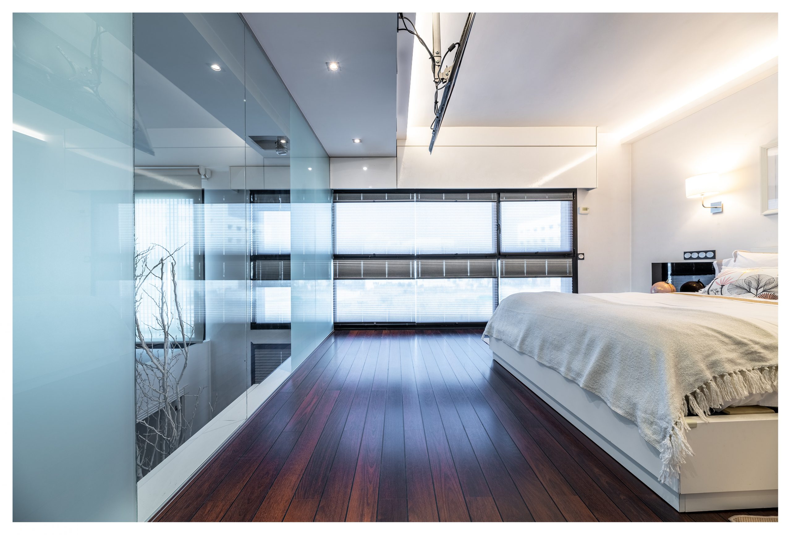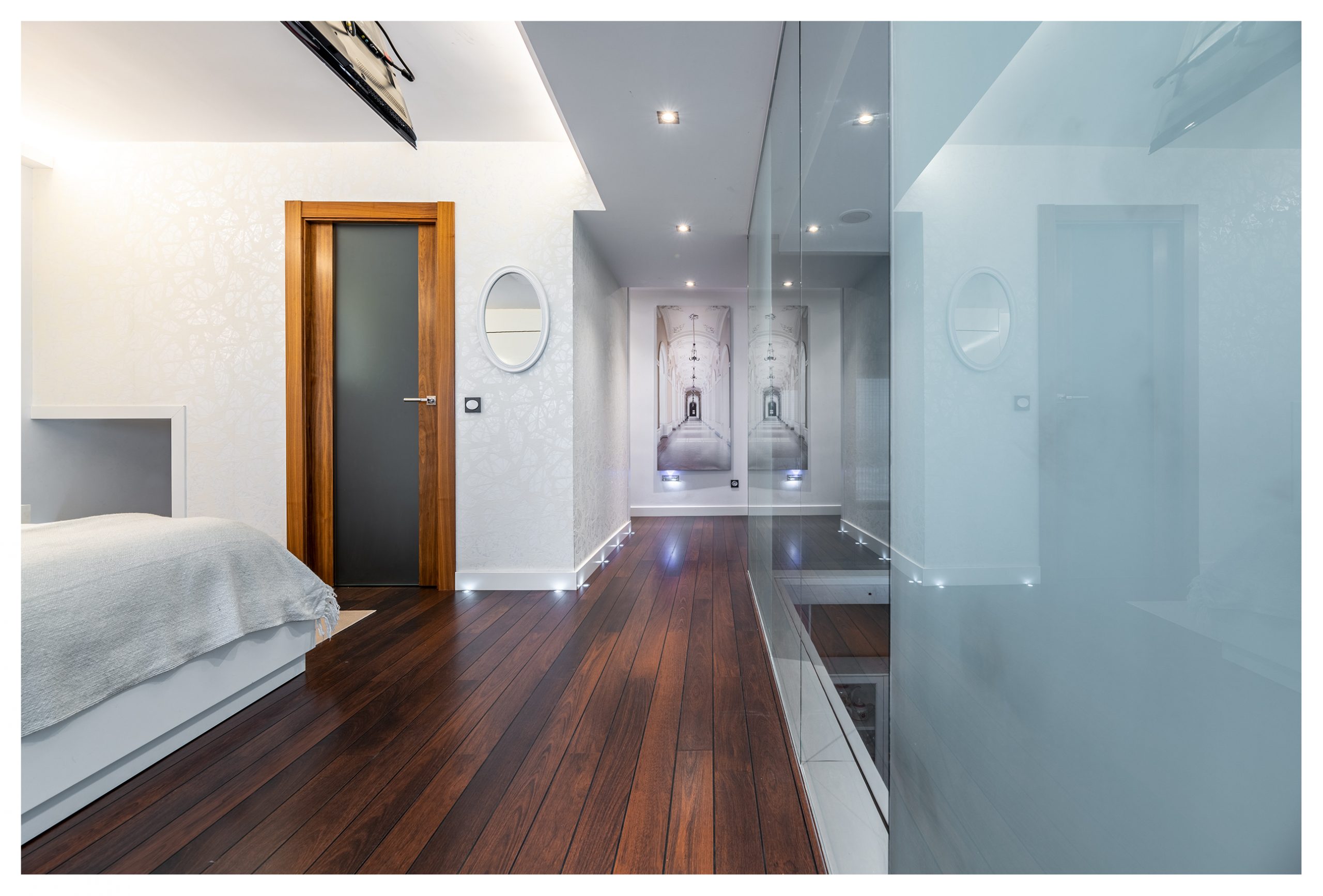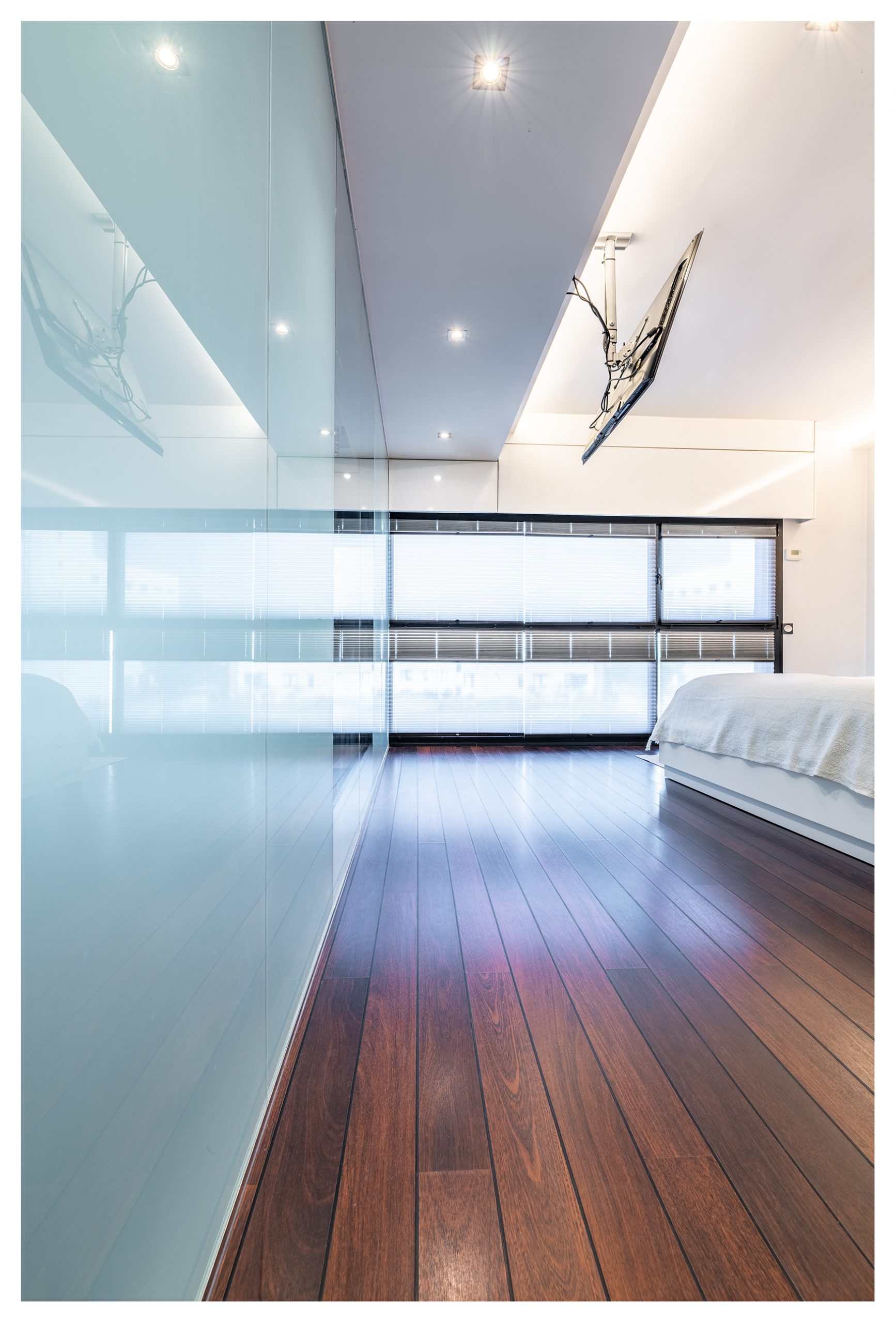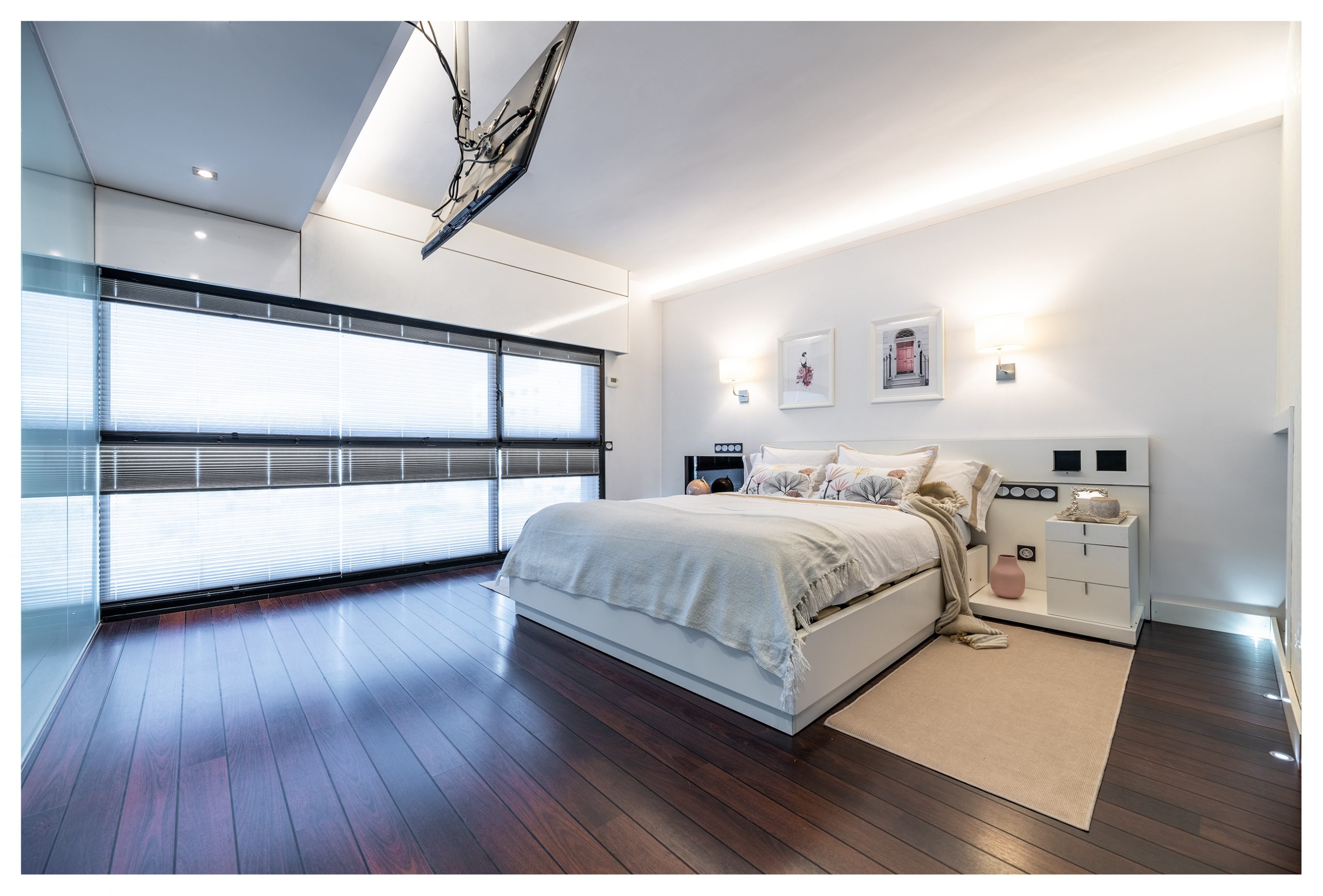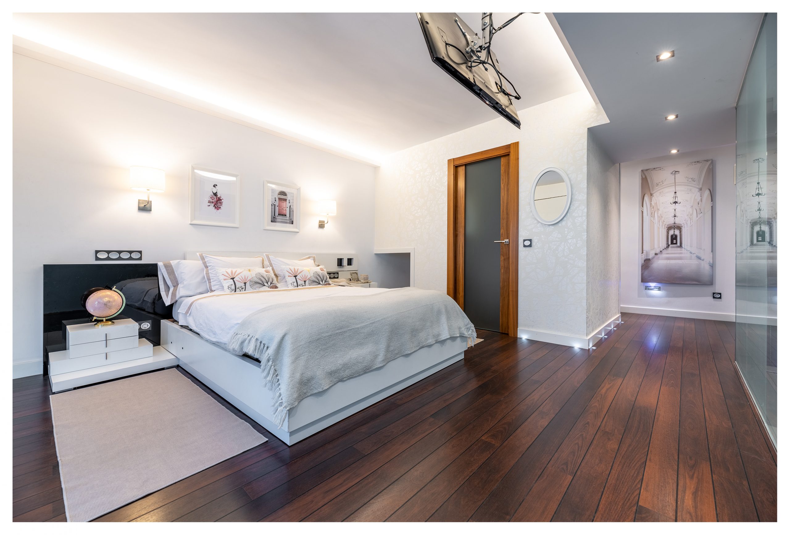El dormitorio principal es otra de las joyas de la casa. Una cama de 160cm x 200cm con un colchón de Viscoelástica de la marca Flex indescriptiblemente cómodo. Una pared completa de cristal nos da vista al exterior del inmueble, aportando una gran luminosidad, tanto que a veces, es incluso necesario filtrar gracias el sistema de persianas de diseño noche-día que disponen todas las ventanas de la casa. Del mismo modo, este dormitorio recibe una iluminación natural adicional ya que, en frente de la cama, nos encontramos un muro completo de cristal que nos da visión a la planta baja. A través de éste de muro, divisamos otro de los grandes ventanales de la casa. Éste posee dos estores motorizados de 3 metros de ancho, (uno 100% opaco, y otro traslucido). La habitación dispone de señal de TV, red, tlf, con soporte en el techo para TV, así como una zona habilitada para otros dispositivos (DVD y/o Blu-ray, PlayStation, etc…). En esta habitación, se puede obtener numerosos ambientes de iluminación gracias a las luminarias de techo regulables, como a través de las luces indirectas repartidas por todo el dormitorio, o incluso, gracias a las lámparas de pared.