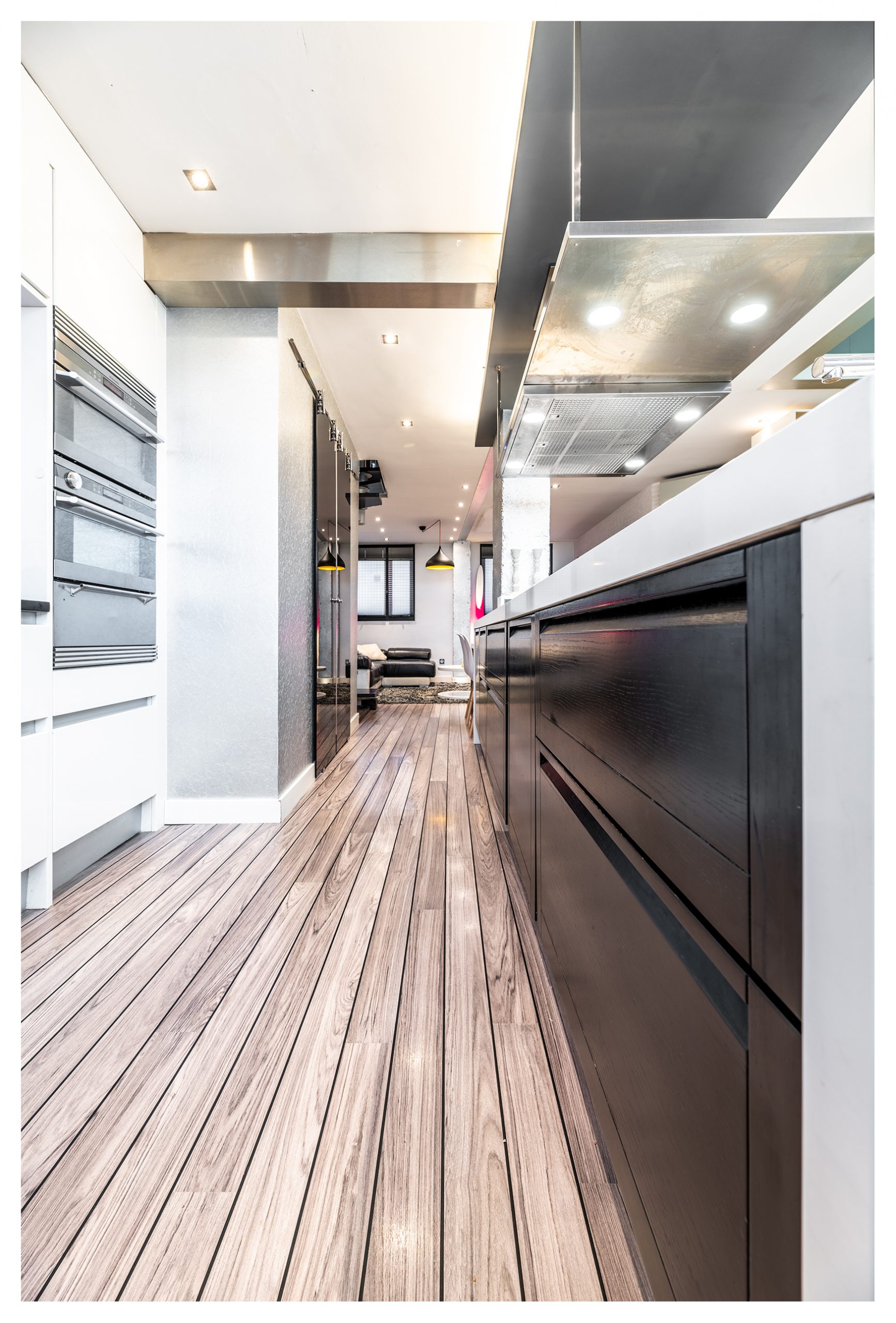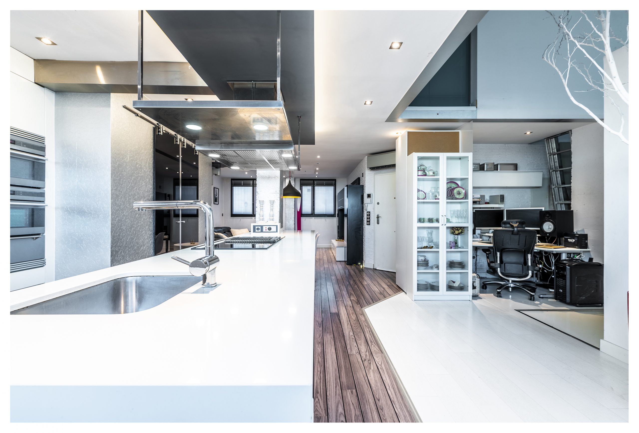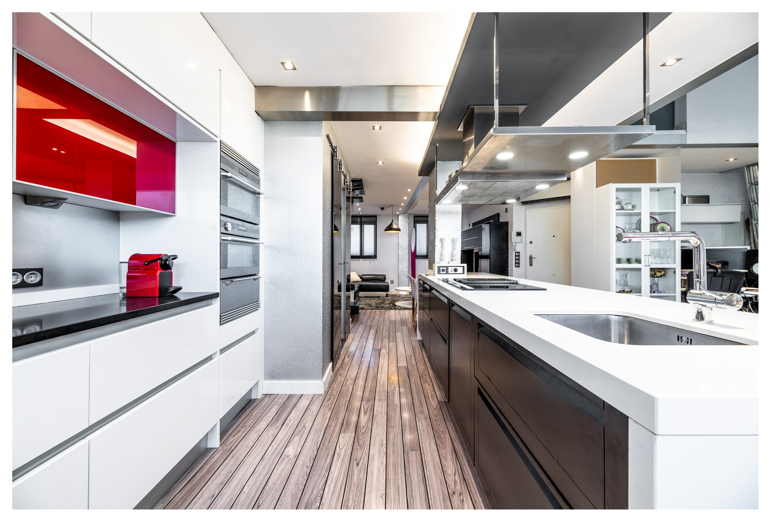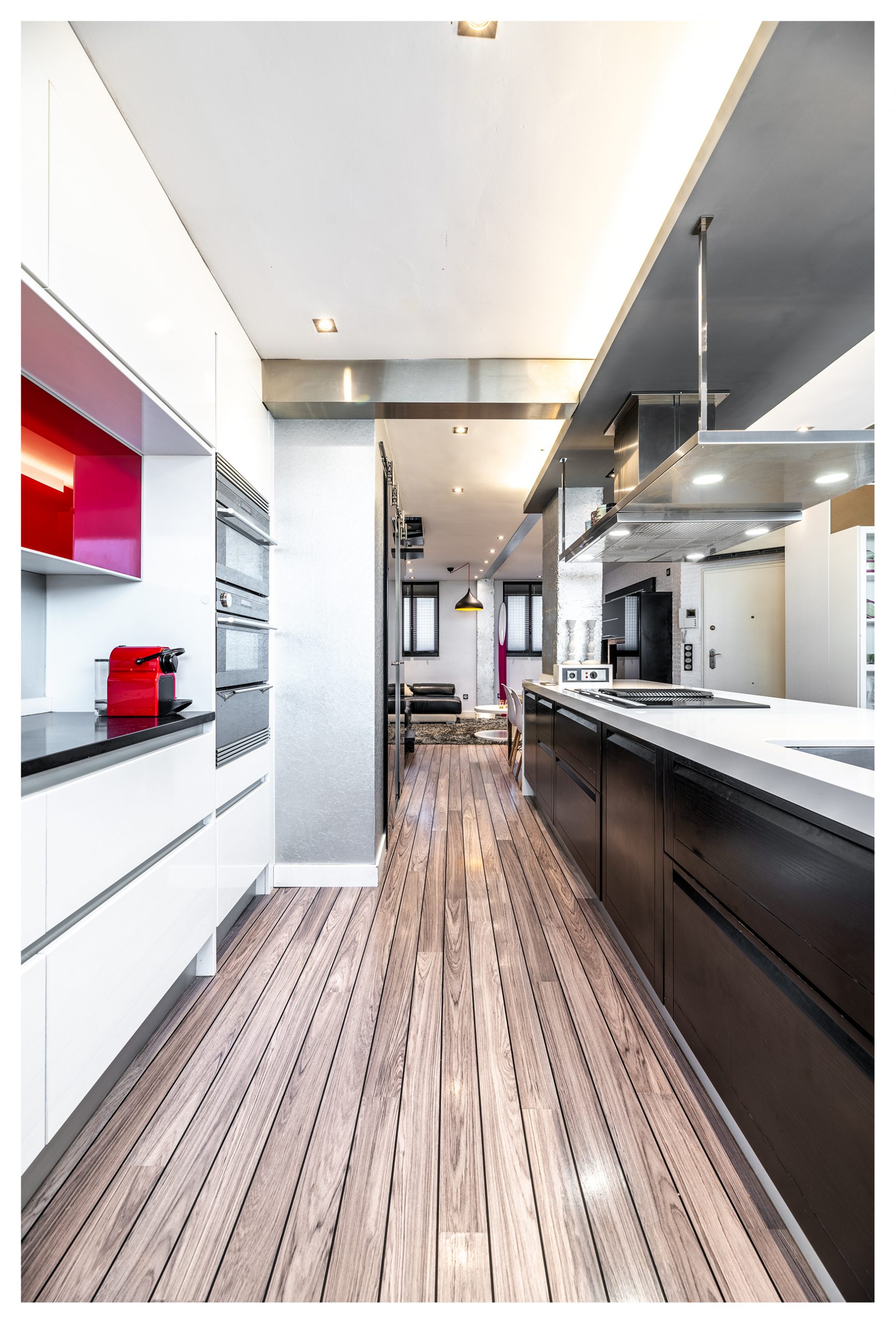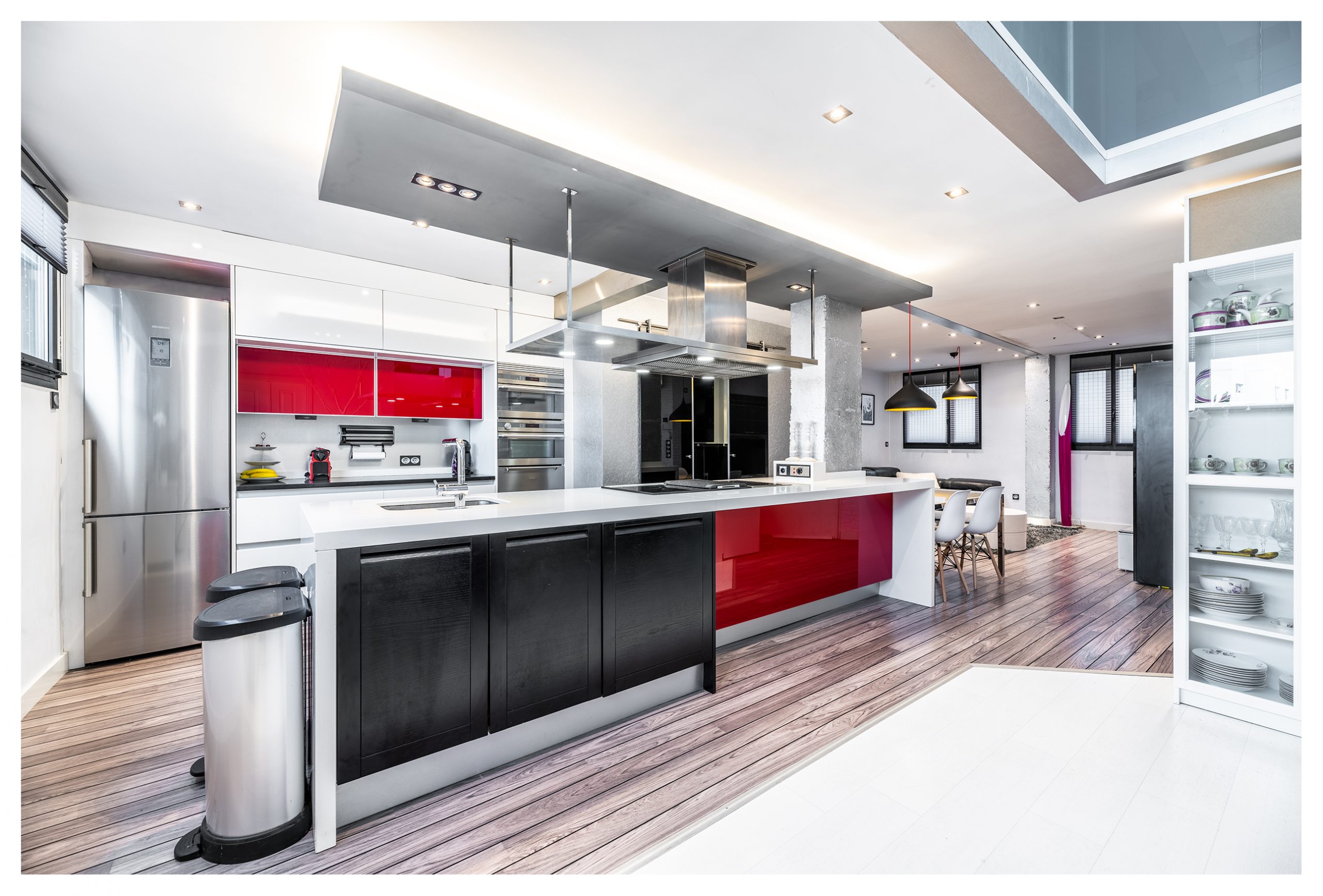 La cocina fue diseñada por el prestigioso diseñador italiano Claudio Salvarani. Un espacio que invita a disfrutar cómoda y holgadamente de esos momentos culinarios, incluso a los más reacios a ponerse un delantal. Dotada con una espectacular campana extractora de la marca Pando. Ésta se encuentra volada sobre la tremenda isla de Silestone blanco de más de 4 metros de longitud por 90cm de ancho. Al otro lado, tenemos otra zona de trabajo de casi 2 metros para el pinche de cocina. Muebles lacados sobre madera de poro abierto, con herrajes amortiguados de la marca Blum. Del mismo modo, la cocina se entrega con un espectacular lavavajillas SMEG imperceptible tanto sonora como visualmente por encontrarse panelado con madera. También está dotada de un gran frigorífico de más de 2 metros de altura, vitrocerámica, horno y microondas encastrados con diseño en acero.