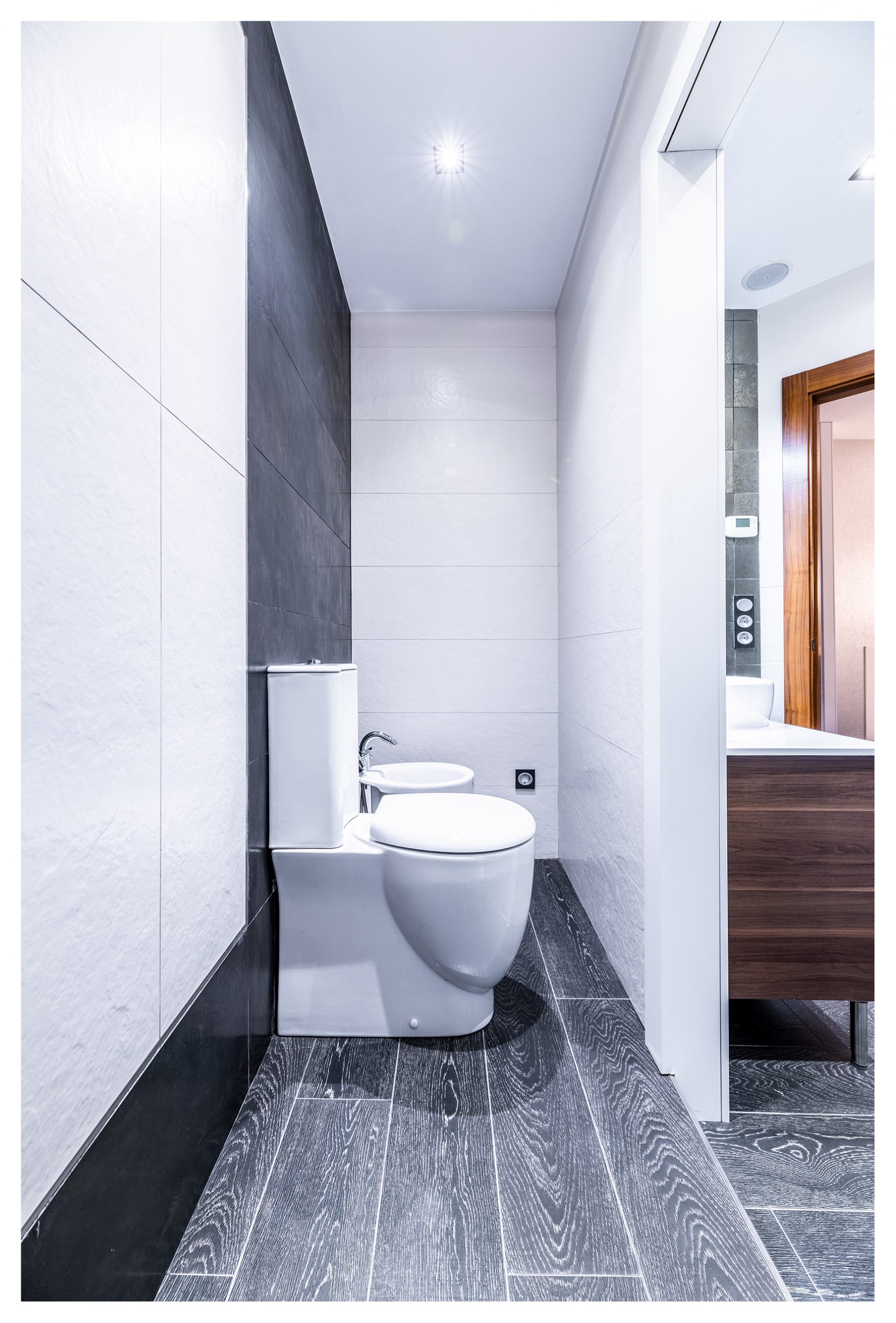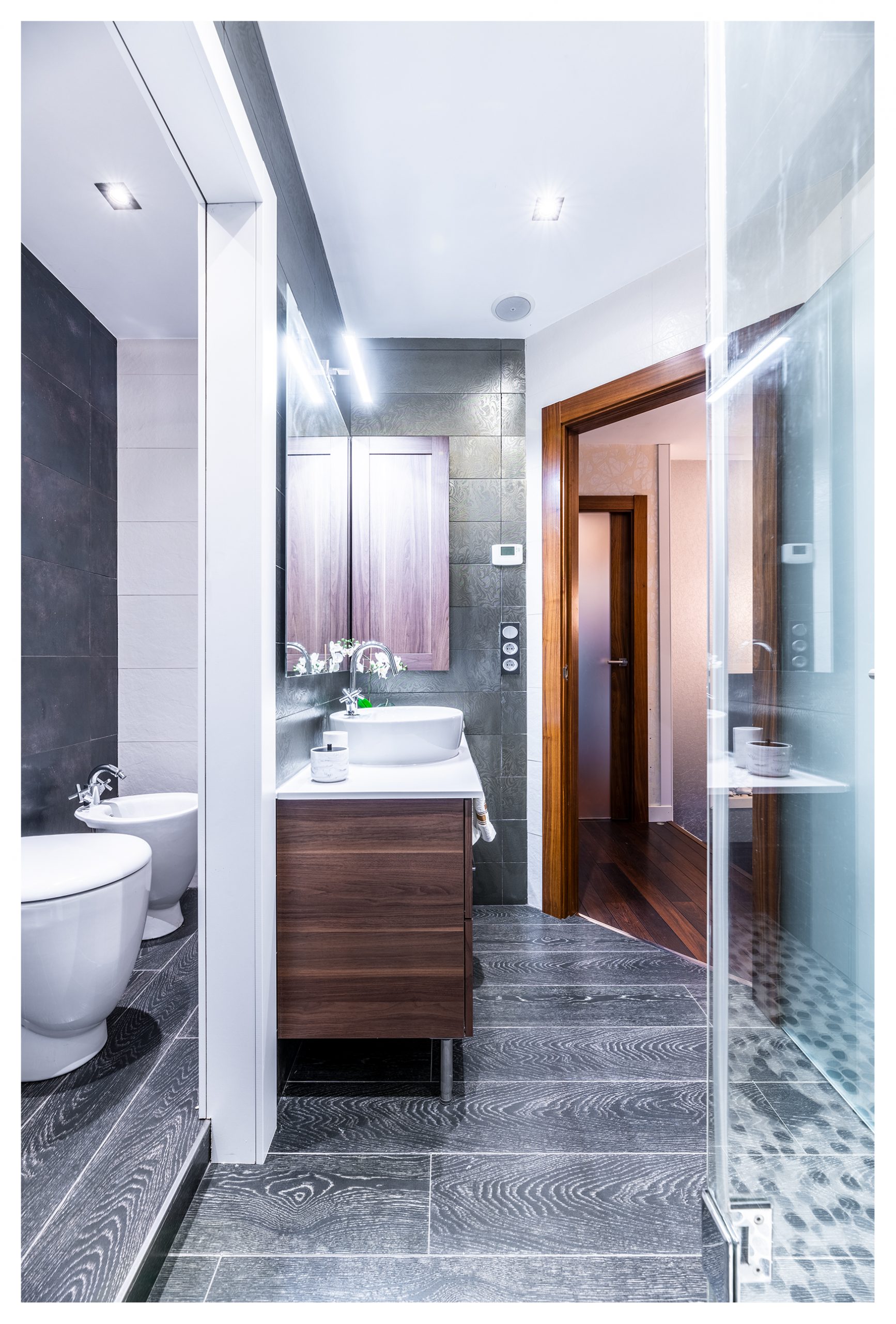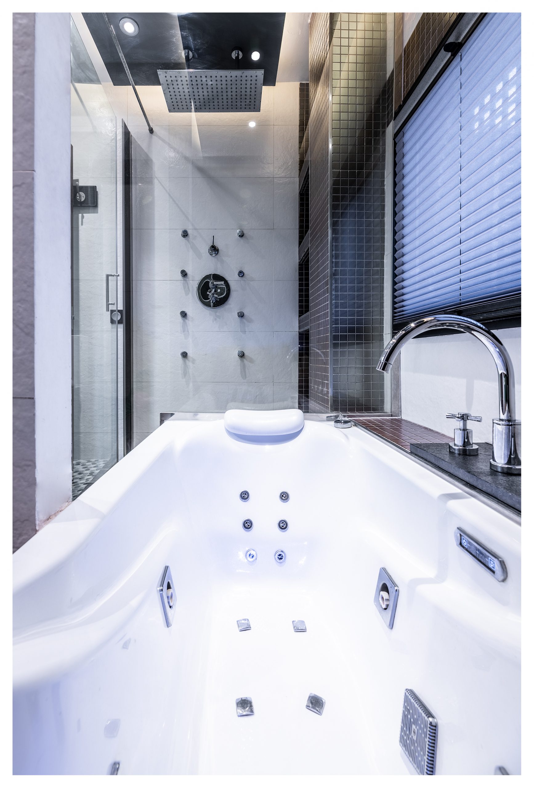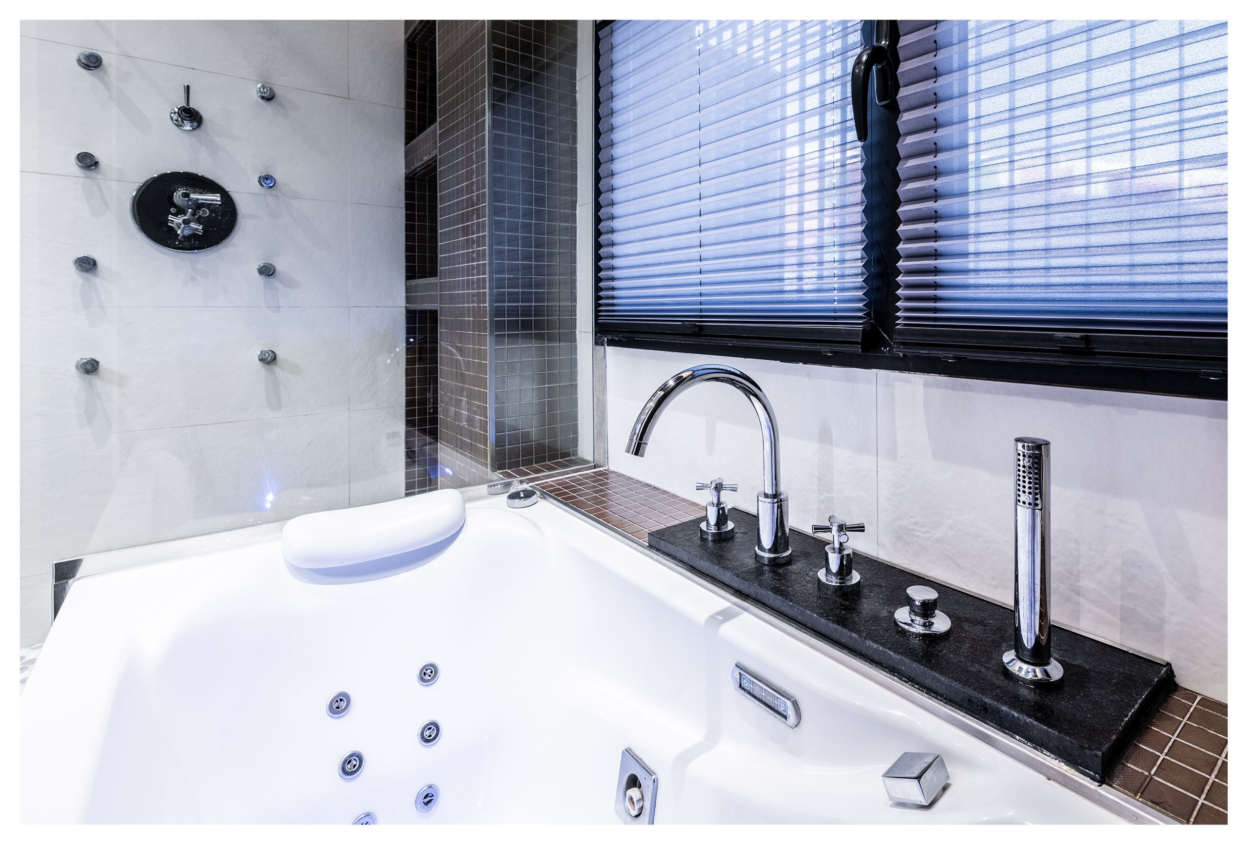 Si salimos del vestidor por la otra puerta, nos encontramos directamente en el distribuidor de la segunda planta. Una vez allí, podemos dirigirnos al cuarto de baño principal donde el minimalismo, la elegancia y el lujo definen esta estancia. Un baño completamente alicatado con elementos porcelánicos de primera de la marca Porcelanosa. En éste, se construyó una columna de hidromasaje de obra con grifería termostática, que se puede intercambiar por el inmenso rociador extraplano efecto lluvia, todo en inox. El sistema de grifería de la ducha está valorado en más de 2000€. Pero aún hay más, ya que, si lo desea, podría darse un baño relajante en la bañera de hidromasaje con números sistemas de confort como jet de aire, chorros de agua, colorterapia y aromaterapia. Los sanitarios, por supuesto, no desmerecen al resto de elementos descritos, siendo éstos de diseño del mismo modo.