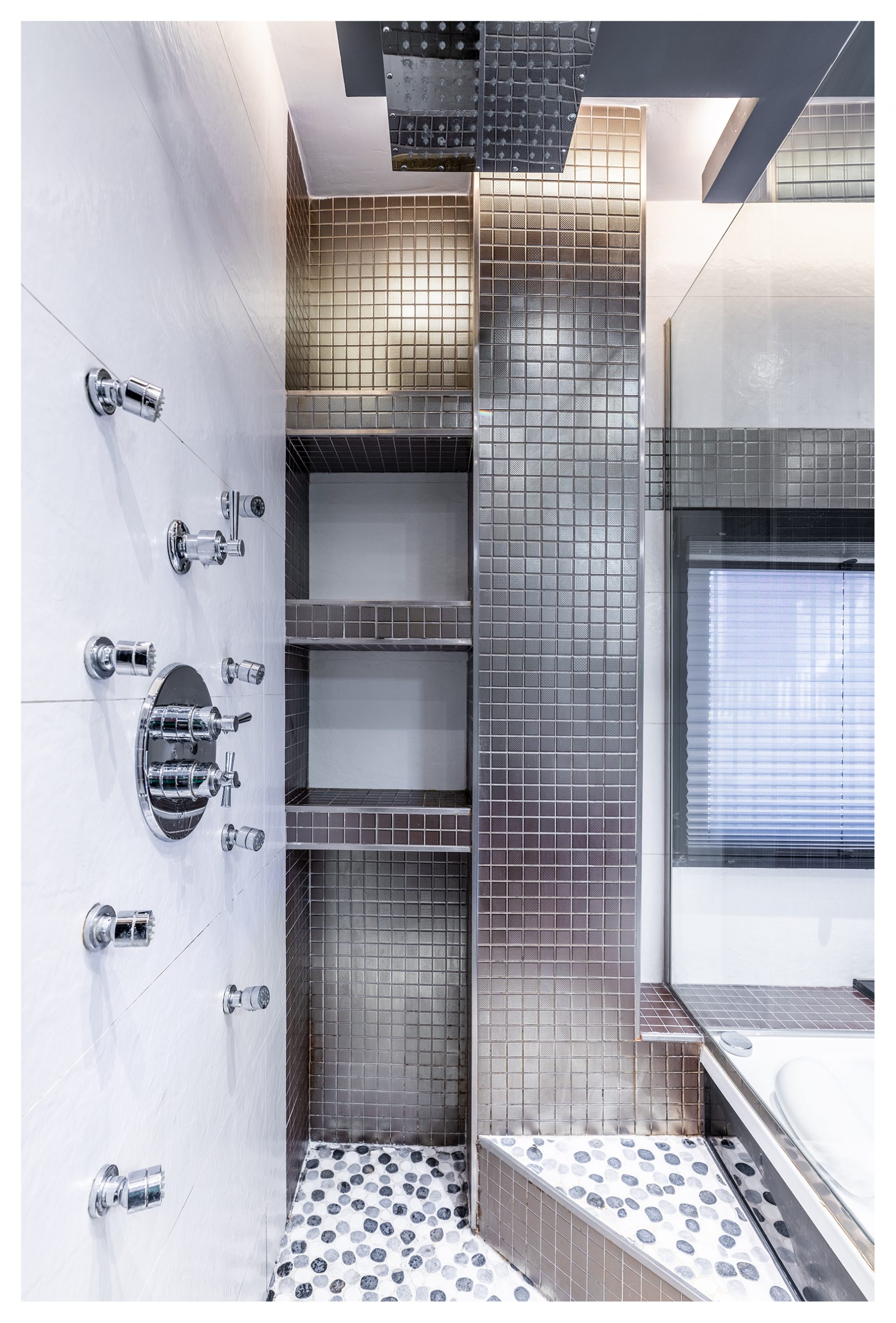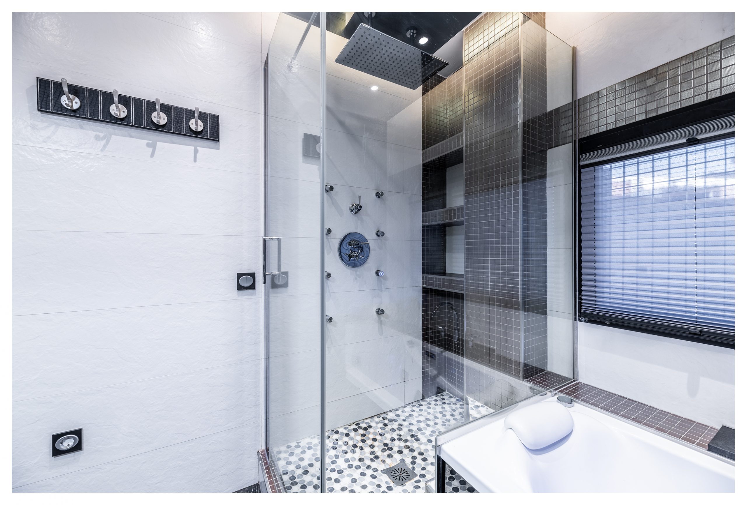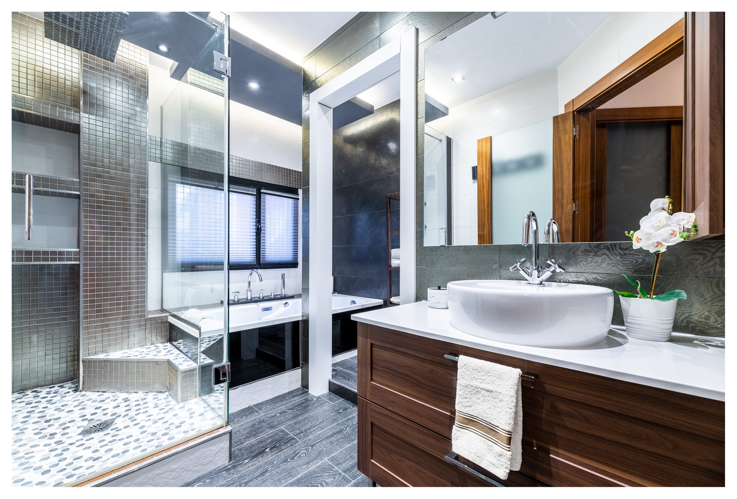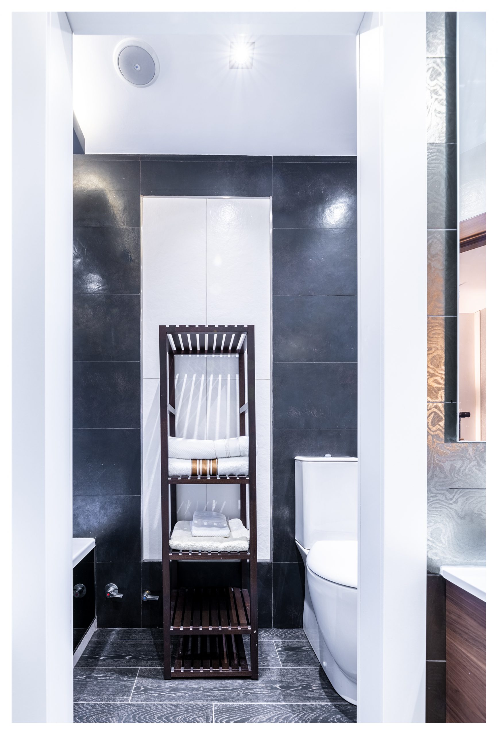 Si salimos del vestidor por la otra puerta, nos encontramos directamente en el distribuidor de la segunda planta. Una vez allí, podemos dirigirnos al cuarto de baño principal donde el minimalismo, la elegancia y el lujo definen esta estancia. Un baño completamente alicatado con elementos porcelánicos de primera de la marca Porcelanosa. En éste, se construyó una columna de hidromasaje de obra con grifería termostática, que se puede intercambiar por el inmenso rociador extraplano efecto lluvia, todo en inox. El sistema de grifería de la ducha está valorado en más de 2000€. Pero aún hay más, ya que, si lo desea, podría darse un baño relajante en la bañera de hidromasaje con números sistemas de confort como jet de aire, chorros de agua, colorterapia y aromaterapia. Los sanitarios, por supuesto, no desmerecen al resto de elementos descritos, siendo éstos de diseño del mismo modo.