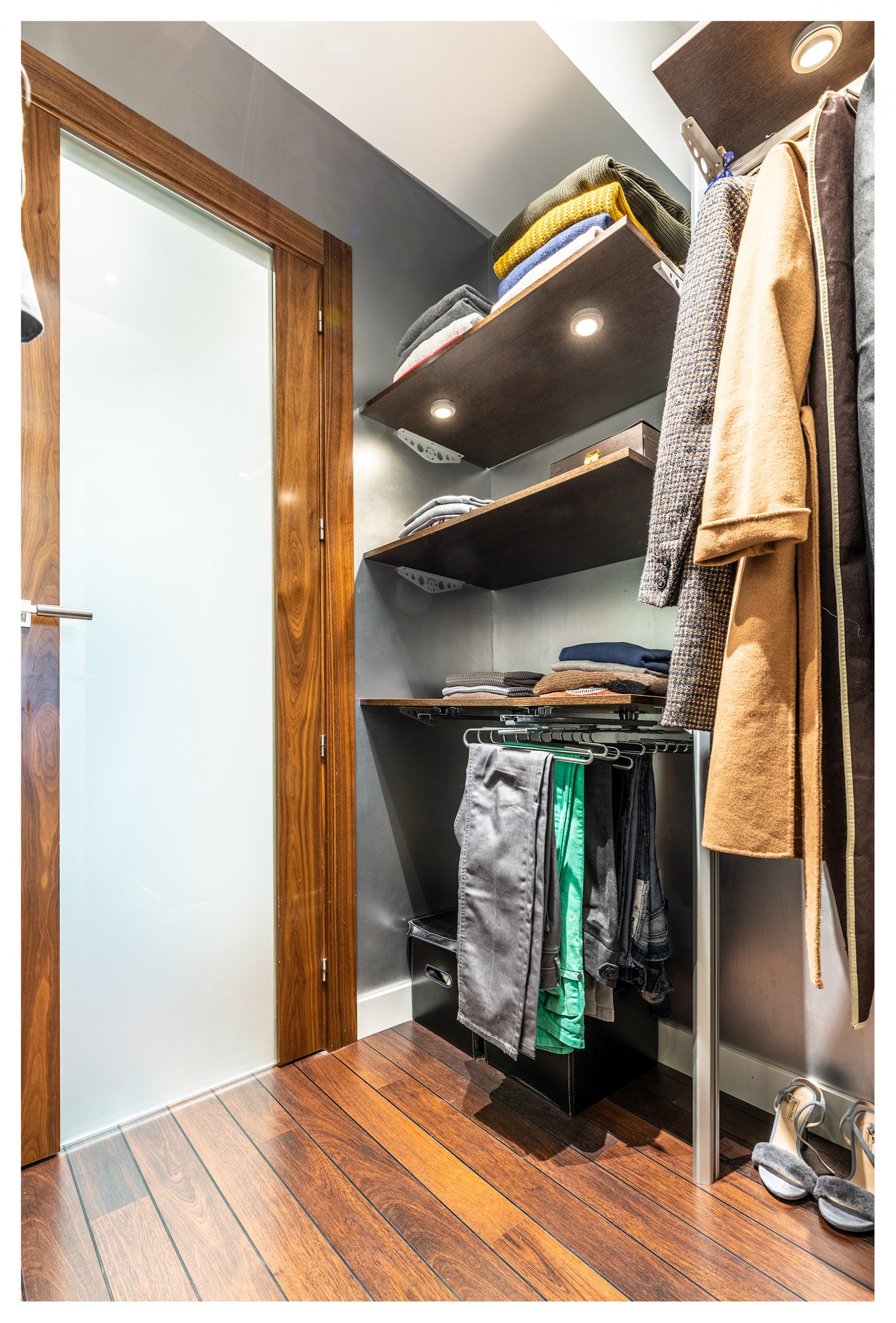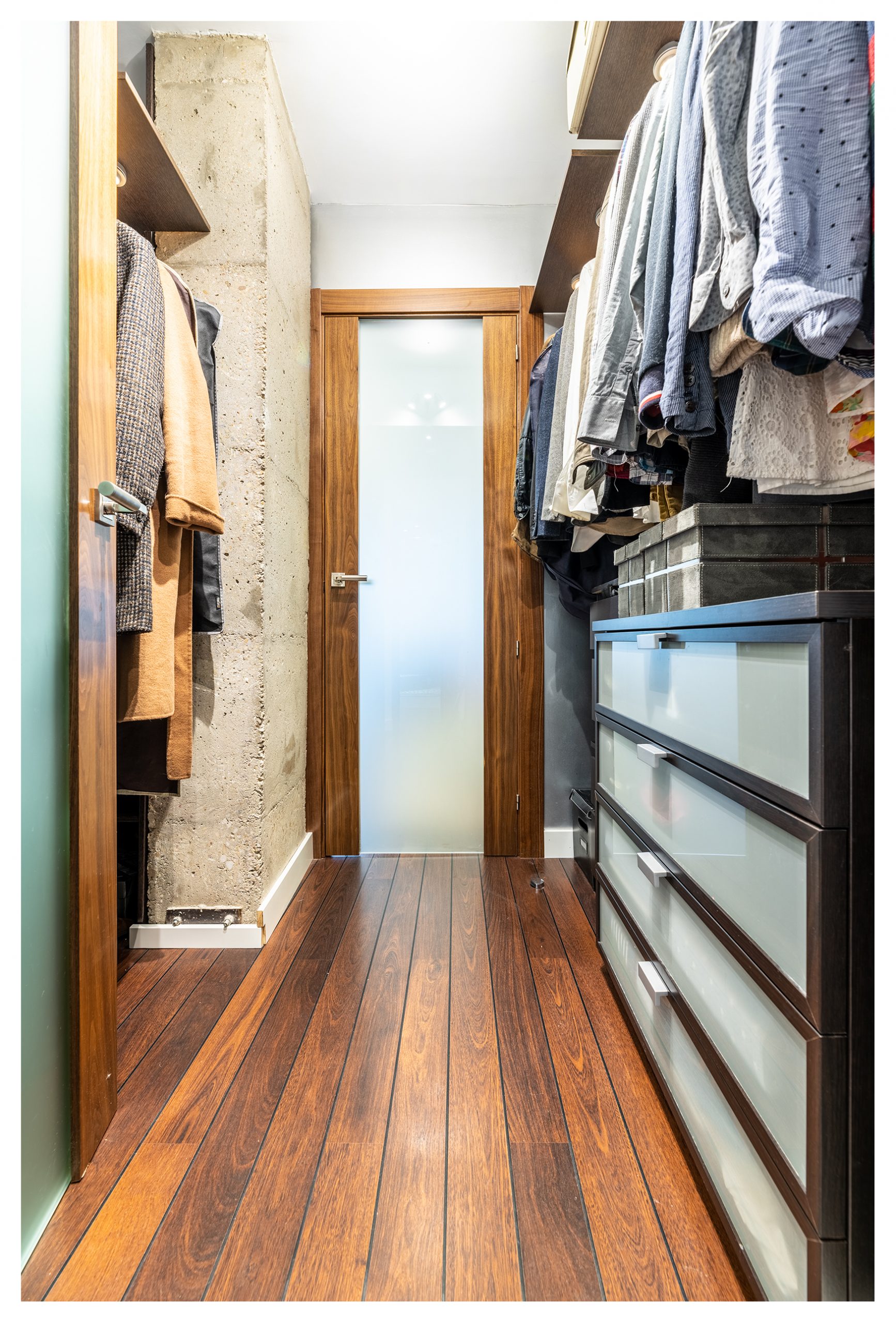 En el dormitorio nos encontramos una puerta que nos da acceso al vestidor. Un espacio pensado para hacer más fácil el día a día. En éste, se oculta tras los percheros, un gran espacio (de unos 2 metros de ancho, por 1,5 m de alto x 1 metros de fondo) para maletas, cajas, y numerosos elementos voluminosos.