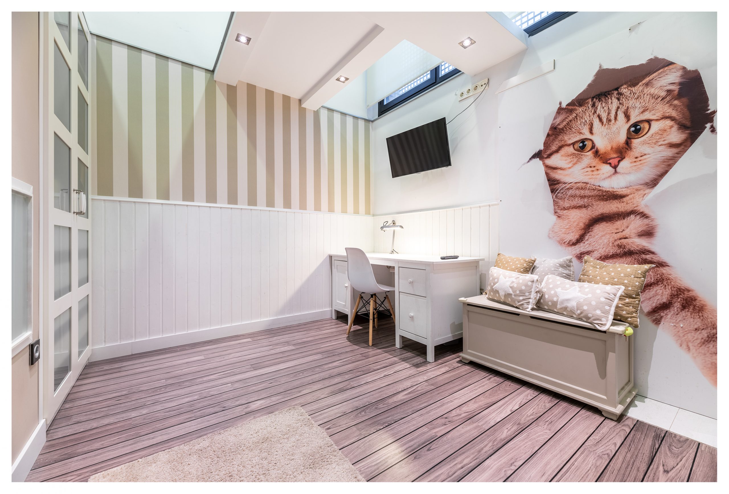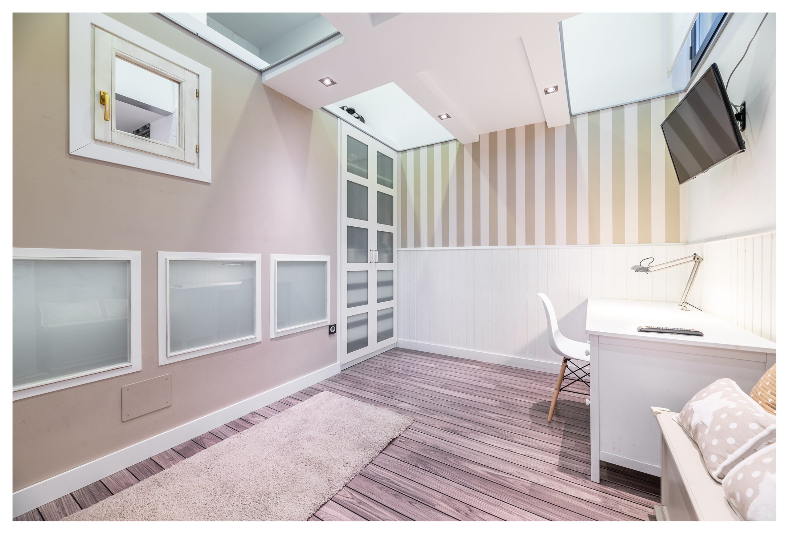 En frente de la cocina, se encuentra situado el segundo dormitorio del inmueble. Con armario empotrado y luces interiores automáticas dentro del mismo. Este dormitorio, dependiendo del inquilino, podrá ser dotado con una cama infantil individual, o del tipo litera si es una familia con dos niños.