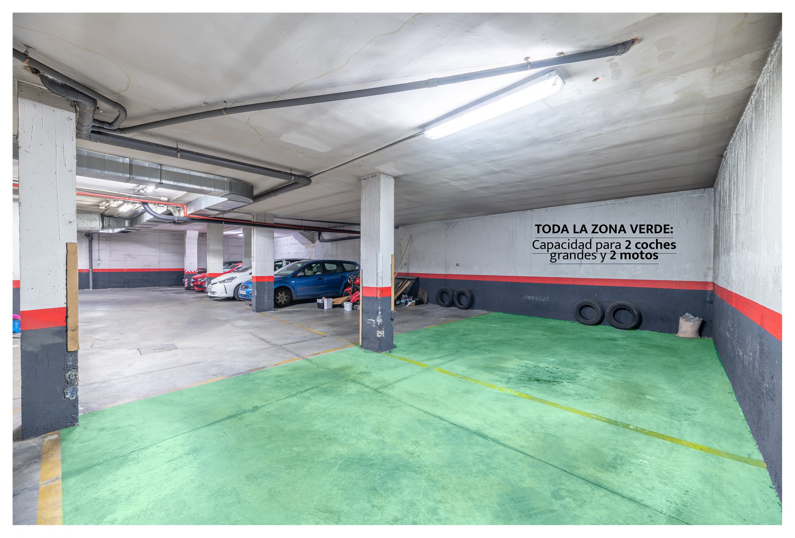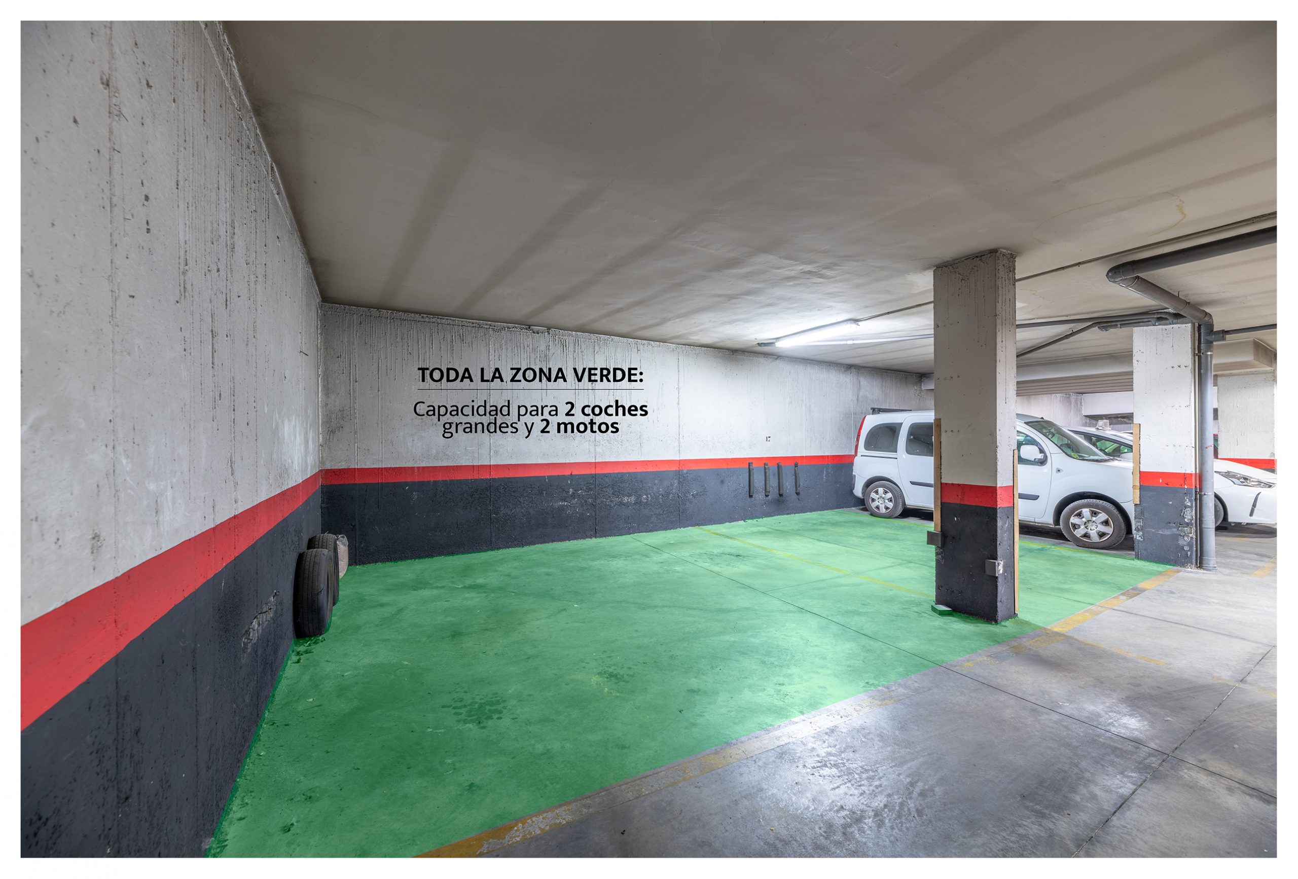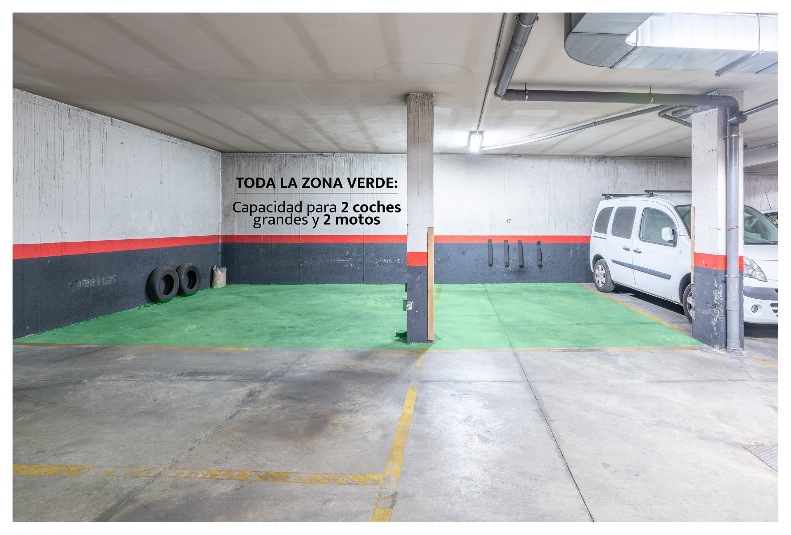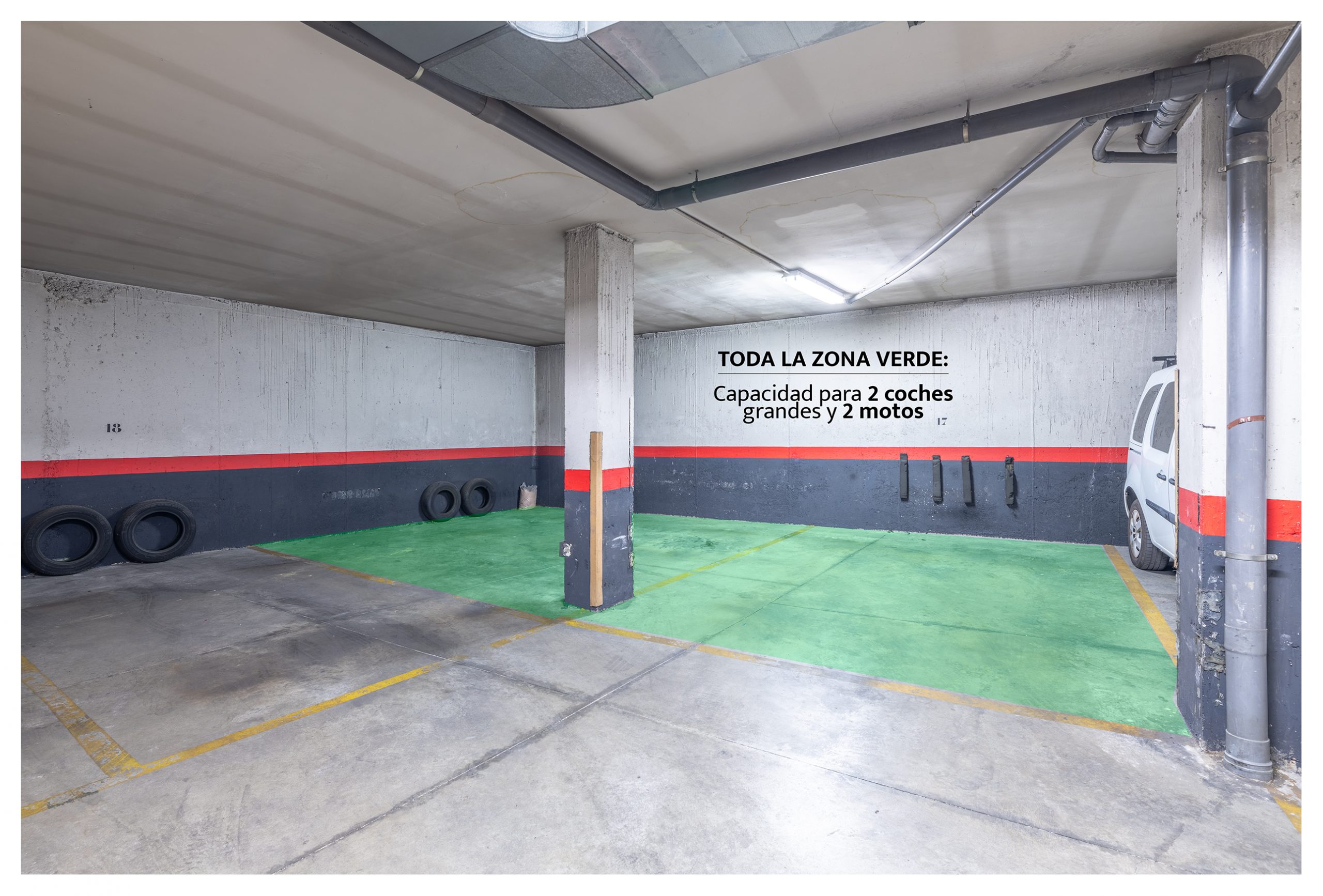 El inmueble dispone de 2 plazas de garaje con capacidad para dos coches grandes + dos motos, con espacio aún sobrante. Son las más grandes con diferencia del parking, con acceso directo a las mismas y sin a penas maniobrar.