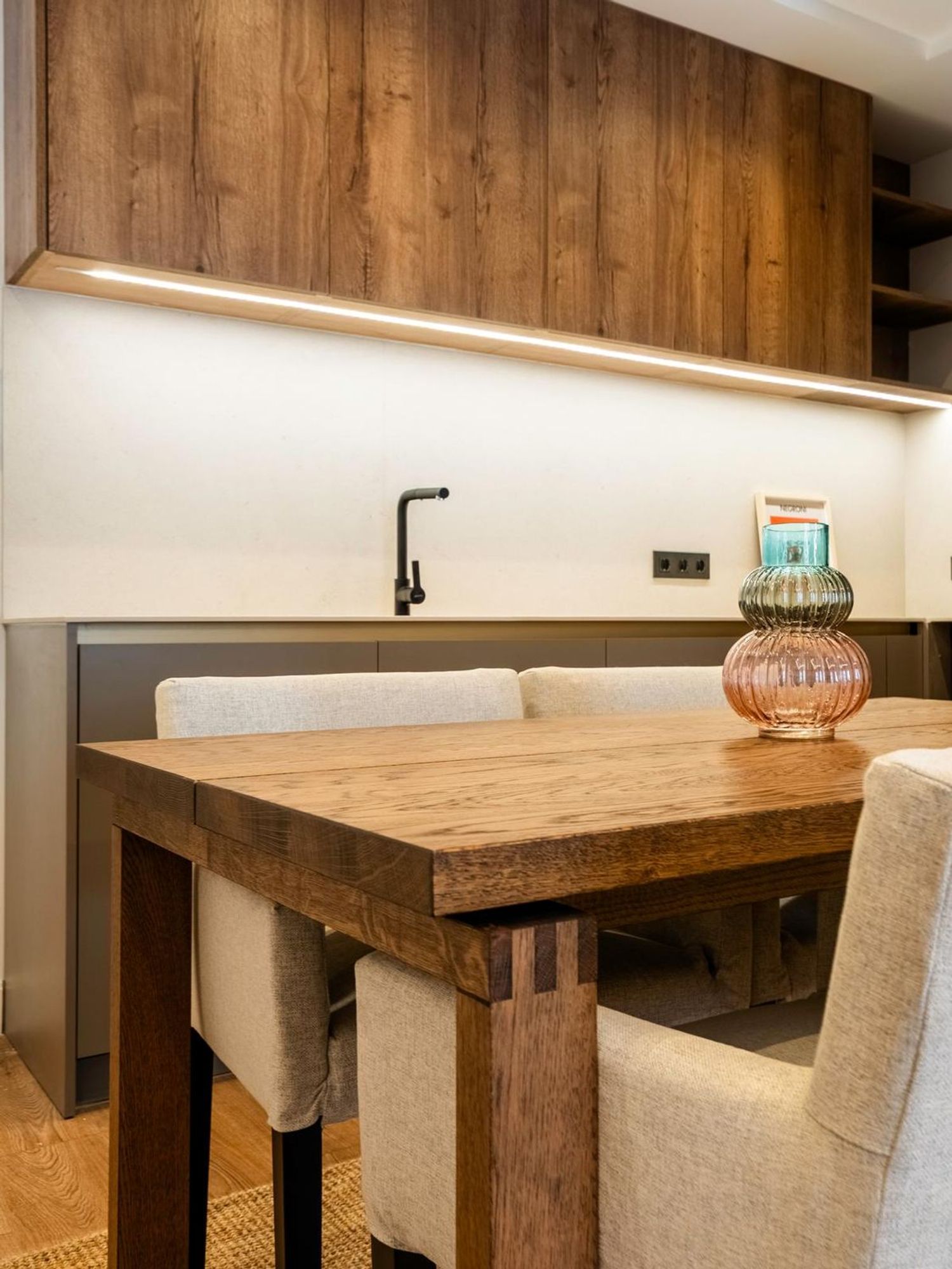 La cocina, completamente equipada con electrodomésticos de alta gama, se integra con el salón-comedor en un concepto abierto que crea un ambiente espacioso y acogedor, perfecto tanto para el día a día como para ocasiones especiales. Su diseño moderno armoniza con cada rincón del hogar.